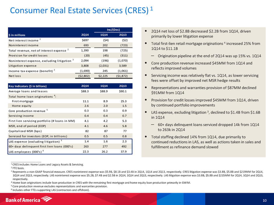 Consumer & Business Banking (CBB) 9 ____________________ 1 FTE basis. 2 Represents a non-GAAP financial measure. For important presentation information, see slide 24, and for reconciliations to GAAP financial measures, see the accompanying reconciliations in the earnings press release and other earnings-related information. 3 Total U.S. consumer credit card includes portfolios in CBB and GWIM. In 2Q14 and 1Q14, $3.2B and $3.3B, respectively, of the U.S. consumer credit card portfolio was included in GWIM with the remaining in CBB. • [ Bullets to come ] • Net income of $1.8B, up 7% from 1Q14 and 29% from 2Q13 Revenue was relatively flat vs. both comparative periods, as lower NII was partially offset by higher service charges • Provision for credit losses declined vs. both 1Q14 and 2Q13, driven by continued improvement in credit quality • Expenses down 4% from 2Q13 and up slightly vs. 1Q14 • Customer activity highlights: – Organic average deposit growth of $10.7B from 1Q14 and $24.5B from 2Q13 Rate paid on deposits declined to 6bps in 2Q14 – Client brokerage assets increased to $106B in 2Q14, driven by improved market valuation and account flows – Mobile banking users reached 15.5MM; 10% of deposit transactions completed through mobile devices – Banking centers reduced to 5,023, down 72 from 1Q14 – Issued over 1.1MM new total U.S. consumer credit cards, 65% to existing customers Average total U.S. consumer credit card 3 balances decreased from 1Q14 due to seasonality; ending balances up $1.3B $ in millions Net interest income 1 $4,929 ($22) ($105) Noninterest income 2,444 (43) 44 Total revenue, net of interest expense 1 7,373 (65) (61) Provision for credit losses 534 (278) (433) Noninterest expense 4,000 37 (184) Income tax expense 1 1,051 54 159 Net income $1,788 $122 $397 Key Indicators ($ in billions) Average deposits $543.6 $534.6 $522.2 Rate paid on deposits 0.06 % 0.07 % 0.12 % Average loans and leases $160.2 $162.1 $163.6 Client brokerage assets 105.9 100.2 84.2 Debit card purchase volumes 69.5 65.9 67.7 Mobile banking customers (MM) 15.5 15.0 13.2 Number of banking centers 5,023 5,095 5,328 Return on average allocated capital 2 24.3 % 22.9 % 18.6 % Allocated capital 2 $29.5 $29.5 $30.0 Total U.S. consumer credit card 3 ($ in billions) Average outstandings $88.1 $89.5 $89.7 Credit card purchase volumes 53.6 48.9 51.9 New card accounts (MM) 1.13 1.03 0.96 Net charge-off ratio 3.11 % 3.25 % 4.10 % Risk-adjusted margin 8.97 9.49 8.41 2Q14 1Q14 2Q13 Inc/(Dec) 2Q14 1Q14 2Q13 2Q14 1Q14 2Q13