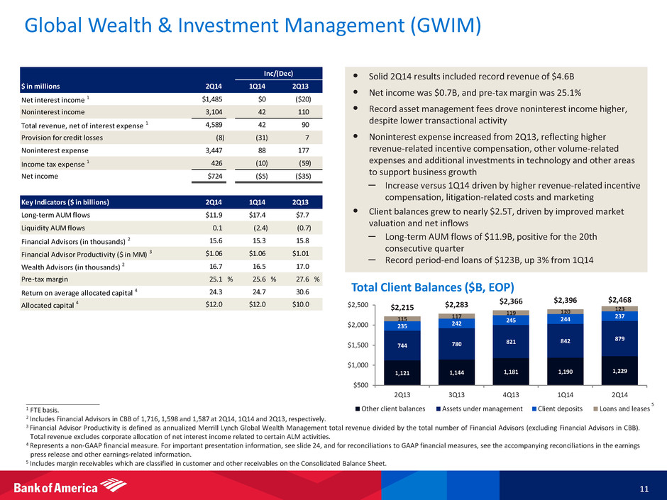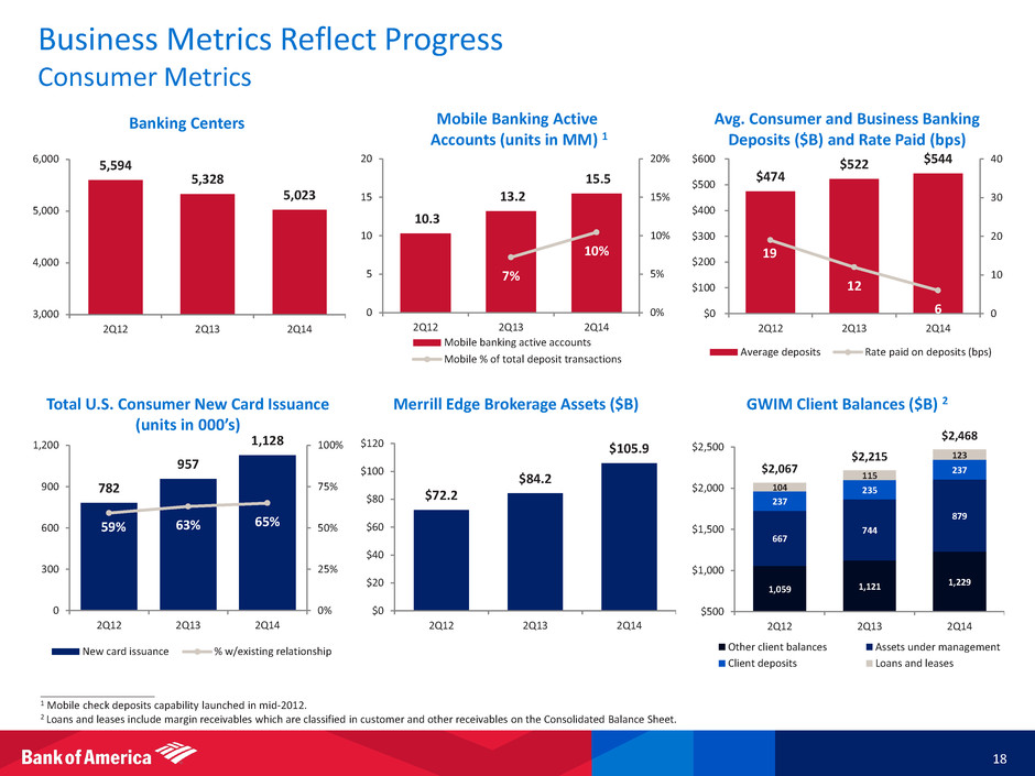 ____________________ 1 FTE basis. FTE basis for the total Corporation and pre-tax, pre-provision earnings are non-GAAP financial measures. 2 For reconciliations to GAAP financial measures, see the accompanying reconciliations in the earnings press release and other earnings-related information. Results by Business Segment $ in millions Total Corporation CBB CRES GWIM Global Banking Global Markets All Other Net interest income 1, 2 $10,226 $4,929 $697 $1,485 $2,239 $952 ($76) Card income 1,441 1,166 - 46 102 39 88 Service charges 1,866 1,091 - 19 680 76 - Investment and brokerage services 3,291 62 - 2,642 36 540 11 Investment banking income (loss) 1,631 2 (1) 75 834 760 (39) Equity investment income 357 41 - 1 - 259 56 Trading account profits (losses) 1,832 (1) 3 45 34 1,768 (17) Mortgage banking income (loss) 527 - 606 1 - - (80) Gains (losses) on sales of debt securities 382 - 7 - - (7) 382 Other income (loss) 407 83 78 275 254 196 (479) Total noninterest income 11,734 2,444 693 3,104 1,940 3,631 (78) Total revenue, net of interest expense 1, 2 21,960 7,373 1,390 4,589 4,179 4,583 (154) Total noninterest expense 18,541 4,000 5,902 3,447 1,899 2,862 431 Pre-tax, pre-provision earnings (loss) 1, 2 3,419 3,373 (4,512) 1,142 2,280 1,721 (585) Provision for credit losses 411 534 (20) (8) 132 19 (246) Income (loss) before income taxes 1, 2 3,008 2,839 (4,492) 1,150 2,148 1,702 (339) Income tax expense (benefit) 1, 2 717 1,051 (1,690) 426 795 601 (466) Net income (loss) $2,291 $1,788 ($2,802) $724 $1,353 $1,101 $127 2Q14 17