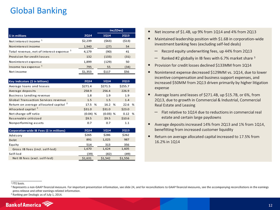 1,121 1,144 1,181 1,190 1,229 744 780 821 842 879 235 242 245 244 237 115 117 119 120 123 $2,215 $2,283 $2,366 $2,396 $2,468 $500 $1,000 $1,500 $2,000 $2,500 2Q13 3Q13 4Q13 1Q14 2Q14 Other client balances Assets under management Client deposits Loans and leases Global Wealth & Investment Management (GWIM) 11 ____________________ 1 FTE basis. 2 Includes Financial Advisors in CBB of 1,716, 1,598 and 1,587 at 2Q14, 1Q14 and 2Q13, respectively. 3 Financial Advisor Productivity is defined as annualized Merrill Lynch Global Wealth Management total revenue divided by the total number of Financial Advisors (excluding Financial Advisors in CBB). Total revenue excludes corporate allocation of net interest income related to certain ALM activities. 4 Represents a non-GAAP financial measure. For important presentation information, see slide 24, and for reconciliations to GAAP financial measures, see the accompanying reconciliations in the earnings press release and other earnings-related information. 5 Includes margin receivables which are classified in customer and other receivables on the Consolidated Balance Sheet. Total Client Balances ($B, EOP) • Solid 2Q14 results included record revenue of $4.6B • Net income was $0.7B, and pre-tax margin was 25.1% • Record asset management fees drove noninterest income higher, despite lower transactional activity • Noninterest expense increased from 2Q13, reflecting higher revenue-related incentive compensation, other volume-related expenses and additional investments in technology and other areas to support business growth – Increase versus 1Q14 driven by higher revenue-related incentive compensation, litigation-related costs and marketing • Client balances grew to nearly $2.5T, driven by improved market valuation and net inflows – Long-term AUM flows of $11.9B, positive for the 20th consecutive quarter – Record period-end loans of $123B, up 3% from 1Q14 $ in millions Net interest income 1 $1,485 $0 ($20) Noninterest income 3,104 42 110 Total revenue, net of interest expense 1 4,589 42 90 Provision for credit losses (8) (31) 7 Noninterest expense 3,447 88 177 Income tax expense 1 426 (10) (59) Net income $724 ($5) ($35) Key Indicators ($ in billions) Long-term AUM flows $11.9 $17.4 $7.7 Liquidity AUM flows 0.1 (2.4) (0.7) Financial Advisors (in thousands) 2 15.6 15.3 15.8 Financial Advisor Productivity ($ in MM) 3 $1.06 $1.06 $1.01 Wealth Advisors (in thous nds) 2 16.7 16.5 17.0 Pre-tax margin 25.1 % 25.6 % 27.6 % Return on average allocated capital 4 24.3 24.7 30.6 Allocated capital 4 $12.0 $12.0 $10.0 Inc/(Dec) 2Q14 1Q14 2Q13 2Q14 1Q14 2Q13 5