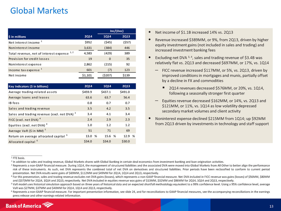 Global Banking 12 ____________________ 1 FTE basis. 2 Represents a non-GAAP financial measure. For important presentation information, see slide 24, and for reconciliations to GAAP financial measures, see the accompanying reconciliations in the earnings press release and other earnings-related information. 3 Ranking per Dealogic as of July 1, 2014. • [ Bullets to come ] • Net income of $1.4B, up 9% from 1Q14 and 4% from 2Q13 Maintained leadership position with $1.6B in corporation-wide investment banking fees (excluding self-led deals) – Record equity underwriting fees, up 44% from 2Q13 – Ranked #2 globally in IB fees with 6.7% market share 3 • Provision for credit losses declined $133MM from 1Q14 • Noninterest expense decreased $129MM vs. 1Q14, due to lower incentive compensation and business support expenses, and increased $50MM from 2Q13 driven primarily by higher litigation expense • Average loans and leases of $271.4B, up $15.7B, or 6%, from 2Q13, due to growth in Commercial & Industrial, Commercial Real Estate and Leasing – Flat relative to 1Q14 due to reductions in commercial real estate and certain large paydowns • Average deposits increased 14% from 2Q13 and 1% from 1Q14, benefitting from increased customer liquidity • Return on average allocated capital increased to 17.5% from 16.2% in 1Q14 $ in millions Net interest income 1 $2,239 ($63) ($13) Noninterest income 1,940 (27) 54 Total revenue, net of interest expense 1 4,179 (90) 41 Provis ion for credit losses 132 (133) (31) Noninterest expense 1,899 (129) 50 Income tax expense 1 795 55 (34) Net income $1,353 $117 $56 Key Indicators ($ in billions) Average loans and leases $271.4 $271.5 $255.7 Average depos its 258.9 256.4 226.9 Bus iness Lending revenue 1.8 1.9 1.9 Global Transaction Services revenue 1.5 1.5 1.4 Return on average a l located capita l 2 17.5 % 16.2 % 22.6 % Al located capita l 2 $31.0 $31.0 $23.0 Net charge-off ratio (0.04) % (0.03) % 0.12 % Reservable cri ticized $9.5 $9.5 $10.6 Nonperforming assets 0.7 0.7 1.1 Corporation-wide IB Fees ($ in millions) Advisory $265 $286 $262 Debt 891 1,025 987 Equity 514 313 356 Gross IB fees (incl . sel f-led) 1,670 1,624 1,605 Sel f-led (39) (82) (49) Net IB fees (excl . sel f-led) $1,631 $1,542 $1,556 2Q14 1Q14 2Q13 Inc/(Dec) 1Q14 2Q132Q14 2Q14 1Q14 2Q13