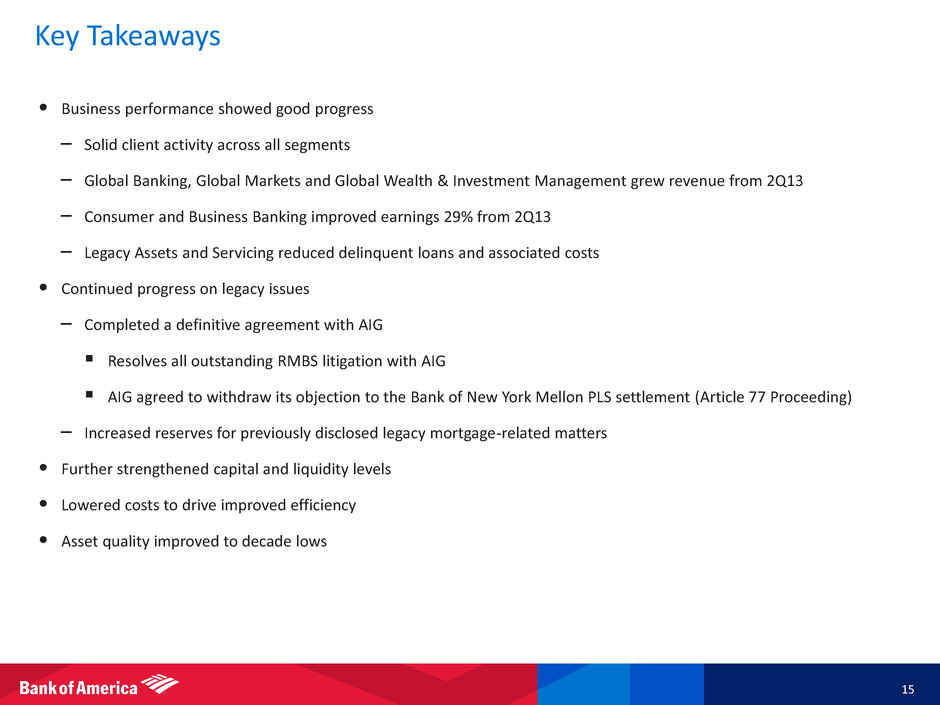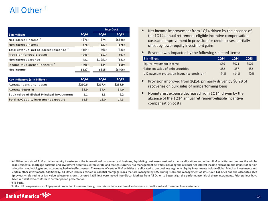 • Net income improvement from 1Q14 driven by the absence of the 1Q14 annual retirement-eligible incentive compensation costs and improvement in provision for credit losses, partially offset by lower equity investment gains • Revenue was impacted by the following selected items: • Provision improved from 1Q14, primarily driven by $0.2B of recoveries on bulk sales of nonperforming loans • Noninterest expense decreased from 1Q14, driven by the absence of the 1Q14 annual retirement-eligible incentive compensation costs $ in millions Equity investment income $56 $674 $576 Gains on sales of debt securi ties 382 357 452 U.K. payment protection insurance provis ion 3 (43) (141) (29) 2Q14 1Q14 2Q13 ____________________ 1 All Other consists of ALM activities, equity investments, the international consumer card business, liquidating businesses, residual expense allocations and other. ALM activities encompass the whole- loan residential mortgage portfolio and investment securities, interest rate and foreign currency risk management activities including the residual net interest income allocation, the impact of certain allocation methodologies and accounting hedge ineffectiveness. The results of certain ALM activities are allocated to our business segments. Equity investments include Global Principal Investments and certain other investments. Additionally, All Other includes certain residential mortgage loans that are managed by LAS. During 1Q14, the management of structured liabilities and the associated DVA (previously referred to as fair value adjustments on structured liabilities) were moved into Global Markets from All Other to better align the performance risk of these instruments. Prior periods have been reclassified to conform to current period presentation. 2 FTE basis. 3 In the U.K., we previously sold payment protection insurance through our international card services business to credit card and consumer loan customers. 14 All Other 1 $ in millions Net interest income 2 ($76) $74 ($348) Noninterest income (78) (537) (375) Total revenue, net of interest expense 2 (154) (463) (723) Provis ion for credit losses (246) (111) (67) Noninterest expense 431 (1,251) (131) Income tax expense (benefi t) 2 (466) 584 (119) Net income $127 $315 ($406) Key Indicators ($ in billi s) Average loans and leases $210.6 $217.4 $238.9 Average depos its 35.9 34.4 34.0 Book va lue of Global Principal Investments 1.1 1.3 2.2 Total BAC equity investme t exposure 11.5 12.0 14.3 Inc/(Dec) 1Q14 2Q13 2Q14 1Q14 2Q13 2Q14
