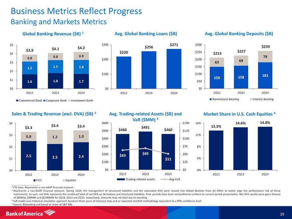 Business Metrics Reflect Progress Consumer Metrics 18 Avg. Consumer and Business Banking Deposits ($B) and Rate Paid (bps) Mobile Banking Active Accounts (units in MM) 1 Banking Centers 5,594 5,328 5,023 3,000 4,000 5,000 6,000 2Q12 2Q13 2Q14 $72.2 $84.2 $105.9 $0 $20 $40 $60 $80 $100 $120 2Q12 2Q13 2Q14 $474 $522 $544 19 12 6 0 10 20 30 40 $0 $100 $200 $300 $400 $500 $600 2Q12 2Q13 2Q14 Average deposits Rate paid on deposits (bps) 782 957 1,128 59% 63% 65% 0% 25% 50% 75% 100% 0 300 600 900 1,200 2Q12 2Q13 2Q14 New card issuance % w/existing relationship 10.3 13.2 15.5 7% 10% 0% 5% 10% 15% 20% 0 5 10 15 20 2Q12 2Q13 2Q14 Mobile banking active accounts Mobile % of total deposit transactions 1,059 1,121 1,229 667 744 879 237 235 237 104 115 123 $2,067 $2,215 $2,468 $500 $1,000 $1,500 $2,000 $2,500 2Q12 2Q13 2Q14 Other client balances Assets under management Client deposits Loans and leases Merrill Edge Brokerage Assets ($B) Total U.S. Consumer New Card Issuance (units in 000’s) GWIM Client Balances ($B) 2 ____________________ 1 Mobile check deposits capability launched in mid-2012. 2 Loans and leases include margin receivables which are classified in customer and other receivables on the Consolidated Balance Sheet.