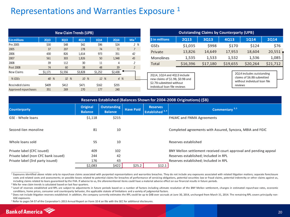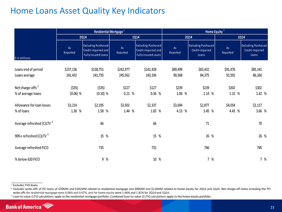 Representations and Warranties Exposure 1 20 ____________________ 1 Exposures identified above relate only to repurchase claims associated with purported representations and warranties breaches. They do not include any exposures associated with related litigation matters; separate foreclosure costs and related costs and assessments; or possible losses related to potential claims for breaches of performance of servicing obligations, potential securities law or fraud claims, potential indemnity or other claims against us, including claims related to loans guaranteed by the FHA. If adverse to us, the aforementioned items could have a material adverse effect on our financial results in future periods. 2 Mix for new claim trends is calculated based on last four quarters. 3 Level of reserves established and RPL are subject to adjustments in future periods based on a number of factors including ultimate resolution of the BNY Mellon settlement, changes in estimated repurchase rates, economic conditions, home prices, consumer and counterparty behavior, the applicable statute of limitations and a variety of judgmental factors. 4 Does not include litigation reserves established. In addition, the company currently estimates the RPL could be up to $4B over accruals at June 30, 2014, unchanged from March 31, 2014. The remaining RPL covers principally non- GSE exposures. 5 Refer to pages 54-57 of the Corporation’s 2013 Annual Report on Form 10-K on file with the SEC for additional disclosures. $ in millions 2Q13 3Q13 4Q13 1Q14 2Q14 GSEs $1,035 $998 $170 $124 $76 Private 13,826 14,649 17,953 18,604 20,551 Monolines 1,535 1,533 1,532 1,536 1,085 Total $16,396 $17,180 $19,655 $20,264 $21,712 Outstanding Claims by Counterparty (UPB) $ in millions Pre 2005 $30 $48 $42 $96 $24 2 % 2005 37 207 278 74 72 7 2006 430 826 1,614 973 351 42 2007 561 303 1,826 50 1,948 45 2008 39 112 30 11 4 2 Post 2008 74 60 38 48 39 2 New Claims $1,171 $1,556 $3,828 $1,252 $2,438 % GSEs 40 % 32 % 10 % 12 % 4 % Rescinded claims $409 $412 $471 $162 $255 Approved repurchases 351 269 270 177 240 New Claim Trends (UPB) Mix 21Q14 2Q142Q13 3Q13 4Q13 Counterparty Original Balance Outstanding Balance Have Paid Reserves Established 3, 4 Commentary 3, 5 GSE - Whole loans $1,118 $215 FHLMC and FNMA Agreements Second-lien monoline 81 10 Completed agreements with Assured, Syncora, MBIA and FGIC Whole loans sold 55 10 Reserves established Private lab l (CFC issued) 409 102 BNY Mellon settlement received court approval and pending appeal Private label (non CFC bank issued) 244 42 Reserves established; Included in RPL Private label (3rd party issued) 176 43 Reserves established; Included in RPL $2,083 $422 $25.2 $12.1 Reserves Established (Balances Shown for 2004-2008 Originations) ($B) 2Q14, 1Q14 and 4Q13 include new claims of $1.9B, $0.9B and $2.7B submitted without individual loan file reviews 2Q14 includes outstanding claims of $6.8B submitted without individual loan file reviews