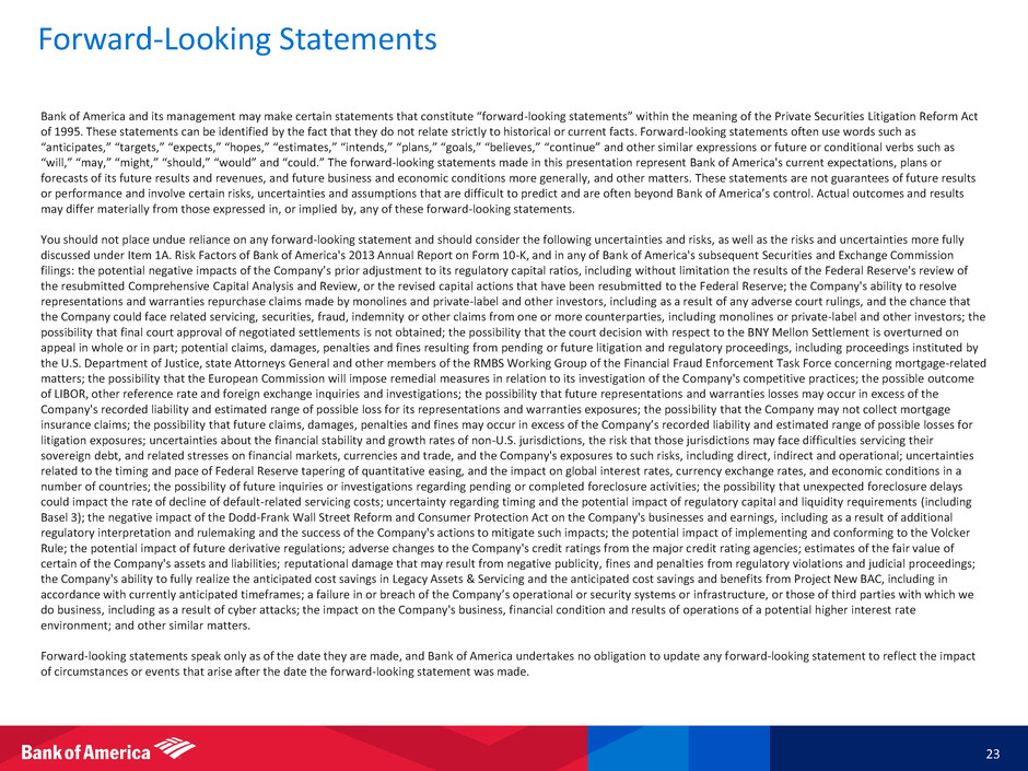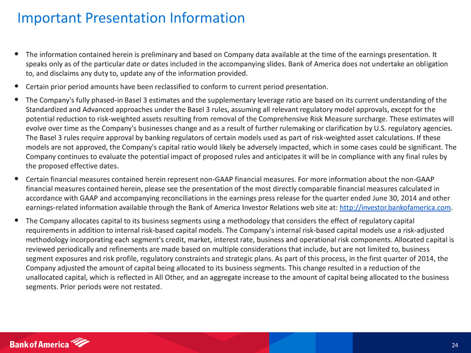 Forward-Looking Statements 23 Bank of America and its management may make certain statements that constitute “forward-looking statements” within the meaning of the Private Securities Litigation Reform Act of 1995. These statements can be identified by the fact that they do not relate strictly to historical or current facts. Forward-looking statements often use words such as “anticipates,” “targets,” “expects,” “hopes,” “estimates,” “intends,” “plans,” “goals,” “believes,” “continue” and other similar expressions or future or conditional verbs such as “will,” “may,” “might,” “should,” “would” and “could.” The forward-looking statements made in this presentation represent Bank of America's current expectations, plans or forecasts of its future results and revenues, and future business and economic conditions more generally, and other matters. These statements are not guarantees of future results or performance and involve certain risks, uncertainties and assumptions that are difficult to predict and are often beyond Bank of America’s control. Actual outcomes and results may differ materially from those expressed in, or implied by, any of these forward-looking statements. You should not place undue reliance on any forward-looking statement and should consider the following uncertainties and risks, as well as the risks and uncertainties more fully discussed under Item 1A. Risk Factors of Bank of America's 2013 Annual Report on Form 10-K, and in any of Bank of America's subsequent Securities and Exchange Commission filings: the potential negative impacts of the Company’s prior adjustment to its regulatory capital ratios, including without limitation the results of the Federal Reserve's review of the resubmitted Comprehensive Capital Analysis and Review, or the revised capital actions that have been resubmitted to the Federal Reserve; the Company's ability to resolve representations and warranties repurchase claims made by monolines and private-label and other investors, including as a result of any adverse court rulings, and the chance that the Company could face related servicing, securities, fraud, indemnity or other claims from one or more counterparties, including monolines or private-label and other investors; the possibility that final court approval of negotiated settlements is not obtained; the possibility that the court decision with respect to the BNY Mellon Settlement is overturned on appeal in whole or in part; potential claims, damages, penalties and fines resulting from pending or future litigation and regulatory proceedings, including proceedings instituted by the U.S. Department of Justice, state Attorneys General and other members of the RMBS Working Group of the Financial Fraud Enforcement Task Force concerning mortgage-related matters; the possibility that the European Commission will impose remedial measures in relation to its investigation of the Company's competitive practices; the possible outcome of LIBOR, other reference rate and foreign exchange inquiries and investigations; the possibility that future representations and warranties losses may occur in excess of the Company's recorded liability and estimated range of possible loss for its representations and warranties exposures; the possibility that the Company may not collect mortgage insurance claims; the possibility that future claims, damages, penalties and fines may occur in excess of the Company’s recorded liability and estimated range of possible losses for litigation exposures; uncertainties about the financial stability and growth rates of non-U.S. jurisdictions, the risk that those jurisdictions may face difficulties servicing their sovereign debt, and related stresses on financial markets, currencies and trade, and the Company's exposures to such risks, including direct, indirect and operational; uncertainties related to the timing and pace of Federal Reserve tapering of quantitative easing, and the impact on global interest rates, currency exchange rates, and economic conditions in a number of countries; the possibility of future inquiries or investigations regarding pending or completed foreclosure activities; the possibility that unexpected foreclosure delays could impact the rate of decline of default-related servicing costs; uncertainty regarding timing and the potential impact of regulatory capital and liquidity requirements (including Basel 3); the negative impact of the Dodd-Frank Wall Street Reform and Consumer Protection Act on the Company's businesses and earnings, including as a result of additional regulatory interpretation and rulemaking and the success of the Company's actions to mitigate such impacts; the potential impact of implementing and conforming to the Volcker Rule; the potential impact of future derivative regulations; adverse changes to the Company's credit ratings from the major credit rating agencies; estimates of the fair value of certain of the Company's assets and liabilities; reputational damage that may result from negative publicity, fines and penalties from regulatory violations and judicial proceedings; the Company's ability to fully realize the anticipated cost savings in Legacy Assets & Servicing and the anticipated cost savings and benefits from Project New BAC, including in accordance with currently anticipated timeframes; a failure in or breach of the Company’s operational or security systems or infrastructure, or those of third parties with which we do business, including as a result of cyber attacks; the impact on the Company's business, financial condition and results of operations of a potential higher interest rate environment; and other similar matters. Forward-looking statements speak only as of the date they are made, and Bank of America undertakes no obligation to update any forward-looking statement to reflect the impact of circumstances or events that arise after the date the forw