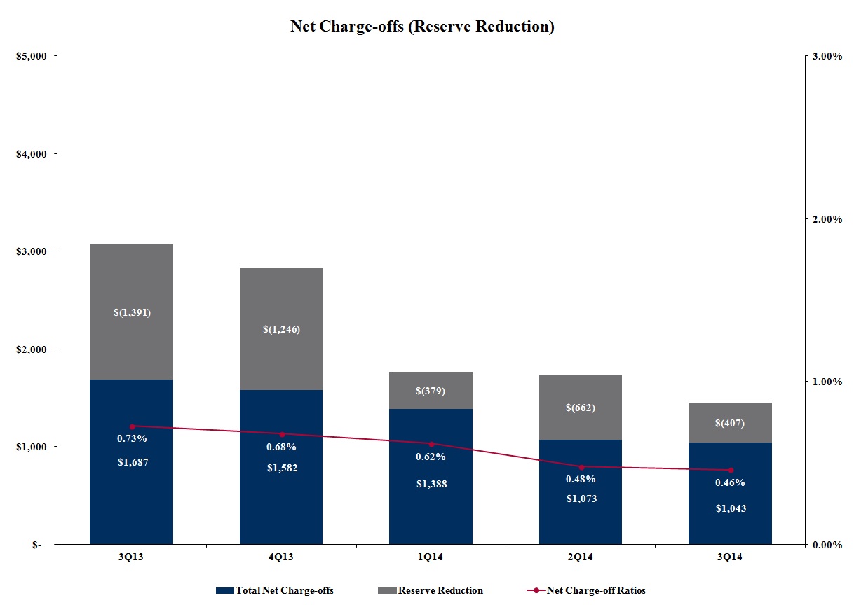 (7) | Net charge-offs exclude $246 million, $160 million and $443 million of write-offs in the purchased credit-impaired loan portfolio at September 30, 2014, June 30, 2014 and September 30, 2013. These write-offs decreased the purchased credit-impaired valuation allowance included as part of the allowance for loan and lease losses. |