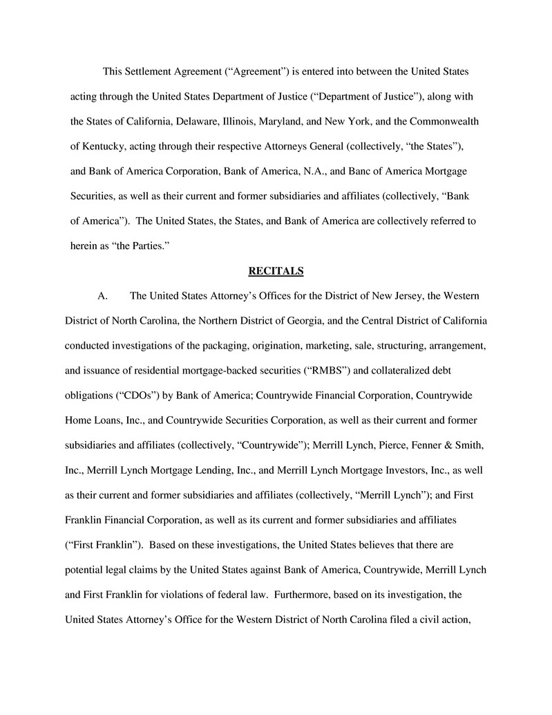 This Settlement Agreement (“Agreement”) is entered into between the United States acting through the United States Department of Justice (“Department of Justice”), along with the States of California, Delaware, Illinois, Maryland, and New York, and the Commonwealth of Kentucky, acting through their respective Attorneys General (collectively, “the States”), and Bank of America Corporation, Bank of America, N.A., and Banc of America Mortgage Securities, as well as their current and former subsidiaries and affiliates (collectively, “Bank of America”). The United States, the States, and Bank of America are collectively referred to herein as “the Parties.” RECITALS A. The United States Attorney’s Offices for the District of New Jersey, the Western District of North Carolina, the Northern District of Georgia, and the Central District of California conducted investigations of the packaging, origination, marketing, sale, structuring, arrangement, and issuance of residential mortgage-backed securities (“RMBS”) and collateralized debt obligations (“CDOs”) by Bank of America; Countrywide Financial Corporation, Countrywide Home Loans, Inc., and Countrywide Securities Corporation, as well as their current and former subsidiaries and affiliates (collectively, “Countrywide”); Merrill Lynch, Pierce, Fenner & Smith, Inc., Merrill Lynch Mortgage Lending, Inc., and Merrill Lynch Mortgage Investors, Inc., as well as their current and former subsidiaries and affiliates (collectively, “Merrill Lynch”); and First Franklin Financial Corporation, as well as its current and former subsidiaries and affiliates (“First Franklin”). Based on these investigations, the United States believes that there are potential legal claims by the United States against Bank of America, Countrywide, Merrill Lynch and First Franklin for violations of federal law. Furthermore, based on its investigation, the United States Attorney’s Office for the Western District of North Carolina filed a civil action,