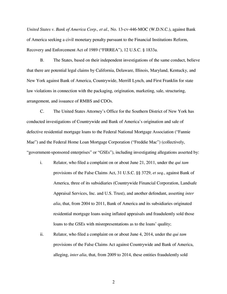United States v. Bank of America Corp., et al., No. 13-cv-446-MOC (W.D.N.C.), against Bank of America seeking a civil monetary penalty pursuant to the Financial Institutions Reform, Recovery and Enforcement Act of 1989 (“FIRREA”), 12 U.S.C. § 1833a. B. The States, based on their independent investigations of the same conduct, believe that there are potential legal claims by California, Delaware, Illinois, Maryland, Kentucky, and New York against Bank of America, Countrywide, Merrill Lynch, and First Franklin for state law violations in connection with the packaging, origination, marketing, sale, structuring, arrangement, and issuance of RMBS and CDOs. C. The United States Attorney’s Office for the Southern District of New York has conducted investigations of Countrywide and Bank of America’s origination and sale of defective residential mortgage loans to the Federal National Mortgage Association (“Fannie Mae”) and the Federal Home Loan Mortgage Corporation (“Freddie Mac”) (collectively, “government-sponsored enterprises” or “GSEs”), including investigating allegations asserted by: i. Relator, who filed a complaint on or about June 21, 2011, under the qui tam provisions of the False Claims Act, 31 U.S.C. §§ 3729, et seq., against Bank of America, three of its subsidiaries (Countrywide Financial Corporation, Landsafe Appraisal Services, Inc. and U.S. Trust), and another defendant, asserting inter alia, that, from 2004 to 2011, Bank of America and its subsidiaries originated residential mortgage loans using inflated appraisals and fraudulently sold those loans to the GSEs with misrepresentations as to the loans’ quality; ii. Relator, who filed a complaint on or about June 4, 2014, under the qui tam provisions of the False Claims Act against Countrywide and Bank of America, alleging, inter alia, that, from 2009 to 2014, these entities fraudulently sold 2