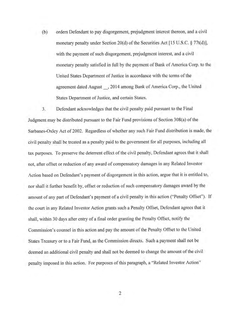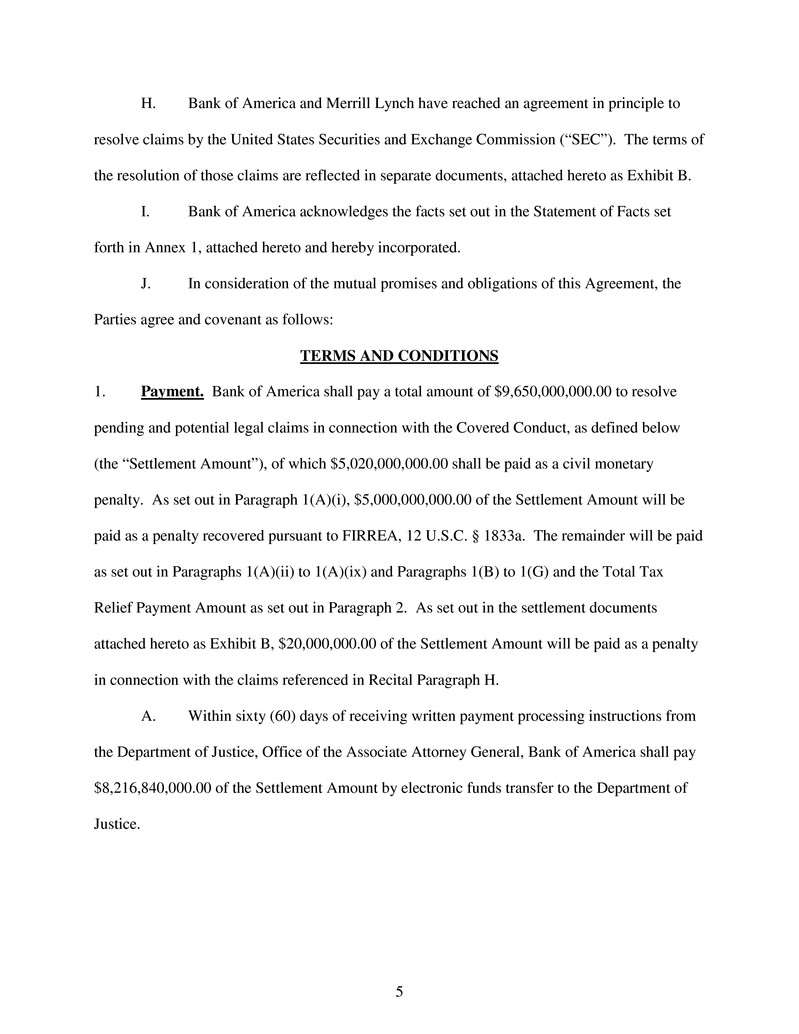 H. Bank of America and Merrill Lynch have reached an agreement in principle to resolve claims by the United States Securities and Exchange Commission (“SEC”). The terms of the resolution of those claims are reflected in separate documents, attached hereto as Exhibit B. I. Bank of America acknowledges the facts set out in the Statement of Facts set forth in Annex 1, attached hereto and hereby incorporated. J. In consideration of the mutual promises and obligations of this Agreement, the Parties agree and covenant as follows: TERMS AND CONDITIONS 1. Payment. Bank of America shall pay a total amount of $9,650,000,000.00 to resolve pending and potential legal claims in connection with the Covered Conduct, as defined below (the “Settlement Amount”), of which $5,020,000,000.00 shall be paid as a civil monetary penalty. As set out in Paragraph 1(A)(i), $5,000,000,000.00 of the Settlement Amount will be paid as a penalty recovered pursuant to FIRREA, 12 U.S.C. § 1833a. The remainder will be paid as set out in Paragraphs 1(A)(ii) to 1(A)(ix) and Paragraphs 1(B) to 1(G) and the Total Tax Relief Payment Amount as set out in Paragraph 2. As set out in the settlement documents attached hereto as Exhibit B, $20,000,000.00 of the Settlement Amount will be paid as a penalty in connection with the claims referenced in Recital Paragraph H. A. Within sixty (60) days of receiving written payment processing instructions from the Department of Justice, Office of the Associate Attorney General, Bank of America shall pay $8,216,840,000.00 of the Settlement Amount by electronic funds transfer to the Department of Justice. 5