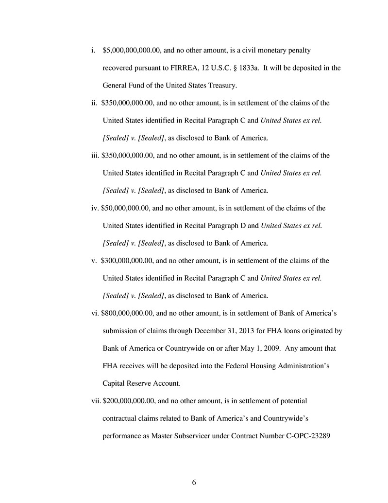 i. $5,000,000,000.00, and no other amount, is a civil monetary penalty recovered pursuant to FIRREA, 12 U.S.C. § 1833a. It will be deposited in the General Fund of the United States Treasury. ii. $350,000,000.00, and no other amount, is in settlement of the claims of the United States identified in Recital Paragraph C and United States ex rel. [Sealed] v. [Sealed], as disclosed to Bank of America. iii. $350,000,000.00, and no other amount, is in settlement of the claims of the United States identified in Recital Paragraph C and United States ex rel. [Sealed] v. [Sealed], as disclosed to Bank of America. iv. $50,000,000.00, and no other amount, is in settlement of the claims of the United States identified in Recital Paragraph D and United States ex rel. [Sealed] v. [Sealed], as disclosed to Bank of America. v. $300,000,000.00, and no other amount, is in settlement of the claims of the United States identified in Recital Paragraph C and United States ex rel. [Sealed] v. [Sealed], as disclosed to Bank of America. vi. $800,000,000.00, and no other amount, is in settlement of Bank of America’s submission of claims through December 31, 2013 for FHA loans originated by Bank of America or Countrywide on or after May 1, 2009. Any amount that FHA receives will be deposited into the Federal Housing Administration’s Capital Reserve Account. vii. $200,000,000.00, and no other amount, is in settlement of potential contractual claims related to Bank of America’s and Countrywide’s performance as Master Subservicer under Contract Number C-OPC-23289 6