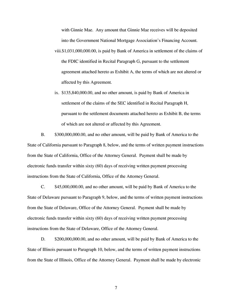with Ginnie Mae. Any amount that Ginnie Mae receives will be deposited into the Government National Mortgage Association’s Financing Account. viii.$1,031,000,000.00, is paid by Bank of America in settlement of the claims of the FDIC identified in Recital Paragraph G, pursuant to the settlement agreement attached hereto as Exhibit A, the terms of which are not altered or affected by this Agreement. ix. $135,840,000.00, and no other amount, is paid by Bank of America in settlement of the claims of the SEC identified in Recital Paragraph H, pursuant to the settlement documents attached hereto as Exhibit B, the terms of which are not altered or affected by this Agreement. B. $300,000,000.00, and no other amount, will be paid by Bank of America to the State of California pursuant to Paragraph 8, below, and the terms of written payment instructions from the State of California, Office of the Attorney General. Payment shall be made by electronic funds transfer within sixty (60) days of receiving written payment processing instructions from the State of California, Office of the Attorney General. C. $45,000,000.00, and no other amount, will be paid by Bank of America to the State of Delaware pursuant to Paragraph 9, below, and the terms of written payment instructions from the State of Delaware, Office of the Attorney General. Payment shall be made by electronic funds transfer within sixty (60) days of receiving written payment processing instructions from the State of Delaware, Office of the Attorney General. D. $200,000,000.00, and no other amount, will be paid by Bank of America to the State of Illinois pursuant to Paragraph 10, below, and the terms of written payment instructions from the State of Illinois, Office of the Attorney General. Payment shall be made by electronic 7