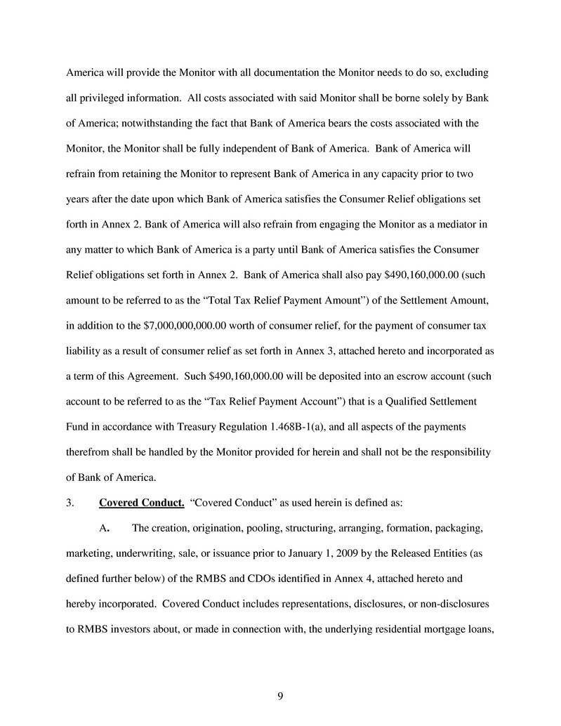 America will provide the Monitor with all documentation the Monitor needs to do so, excluding all privileged information. All costs associated with said Monitor shall be borne solely by Bank of America; notwithstanding the fact that Bank of America bears the costs associated with the Monitor, the Monitor shall be fully independent of Bank of America. Bank of America will refrain from retaining the Monitor to represent Bank of America in any capacity prior to two years after the date upon which Bank of America satisfies the Consumer Relief obligations set forth in Annex 2. Bank of America will also refrain from engaging the Monitor as a mediator in any matter to which Bank of America is a party until Bank of America satisfies the Consumer Relief obligations set forth in Annex 2. Bank of America shall also pay $490,160,000.00 (such amount to be referred to as the “Total Tax Relief Payment Amount”) of the Settlement Amount, in addition to the $7,000,000,000.00 worth of consumer relief, for the payment of consumer tax liability as a result of consumer relief as set forth in Annex 3, attached hereto and incorporated as a term of this Agreement. Such $490,160,000.00 will be deposited into an escrow account (such account to be referred to as the “Tax Relief Payment Account”) that is a Qualified Settlement Fund in accordance with Treasury Regulation 1.468B-1(a), and all aspects of the payments therefrom shall be handled by the Monitor provided for herein and shall not be the responsibility of Bank of America. 3. Covered Conduct. “Covered Conduct” as used herein is defined as: A. The creation, origination, pooling, structuring, arranging, formation, packaging, marketing, underwriting, sale, or issuance prior to January 1, 2009 by the Released Entities (as defined further below) of the RMBS and CDOs identified in Annex 4, attached hereto and hereby incorporated. Covered Conduct includes representations, disclosures, or non-disclosures to RMBS investors about, or made in connection with, the underlying residential mortgage loans, 9