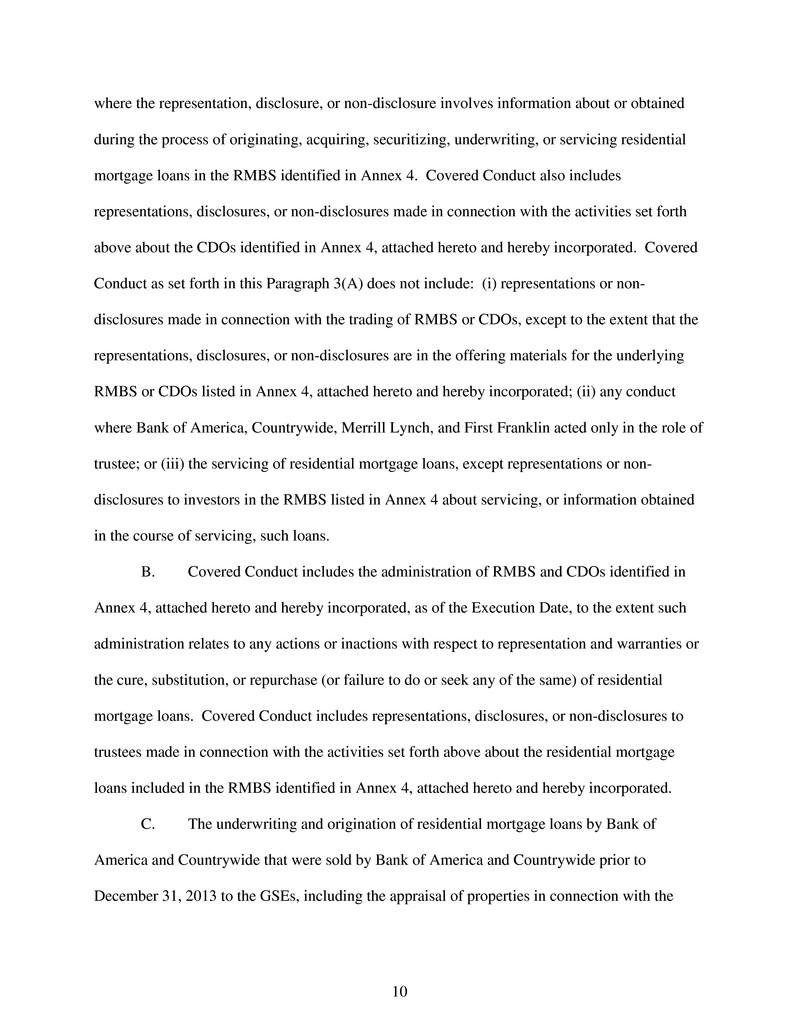 where the representation, disclosure, or non-disclosure involves information about or obtained during the process of originating, acquiring, securitizing, underwriting, or servicing residential mortgage loans in the RMBS identified in Annex 4. Covered Conduct also includes representations, disclosures, or non-disclosures made in connection with the activities set forth above about the CDOs identified in Annex 4, attached hereto and hereby incorporated. Covered Conduct as set forth in this Paragraph 3(A) does not include: (i) representations or non- disclosures made in connection with the trading of RMBS or CDOs, except to the extent that the representations, disclosures, or non-disclosures are in the offering materials for the underlying RMBS or CDOs listed in Annex 4, attached hereto and hereby incorporated; (ii) any conduct where Bank of America, Countrywide, Merrill Lynch, and First Franklin acted only in the role of trustee; or (iii) the servicing of residential mortgage loans, except representations or non- disclosures to investors in the RMBS listed in Annex 4 about servicing, or information obtained in the course of servicing, such loans. B. Covered Conduct includes the administration of RMBS and CDOs identified in Annex 4, attached hereto and hereby incorporated, as of the Execution Date, to the extent such administration relates to any actions or inactions with respect to representation and warranties or the cure, substitution, or repurchase (or failure to do or seek any of the same) of residential mortgage loans. Covered Conduct includes representations, disclosures, or non-disclosures to trustees made in connection with the activities set forth above about the residential mortgage loans included in the RMBS identified in Annex 4, attached hereto and hereby incorporated. C. The underwriting and origination of residential mortgage loans by Bank of America and Countrywide that were sold by Bank of America and Countrywide prior to December 31, 2013 to the GSEs, including the appraisal of properties in connection with the 10