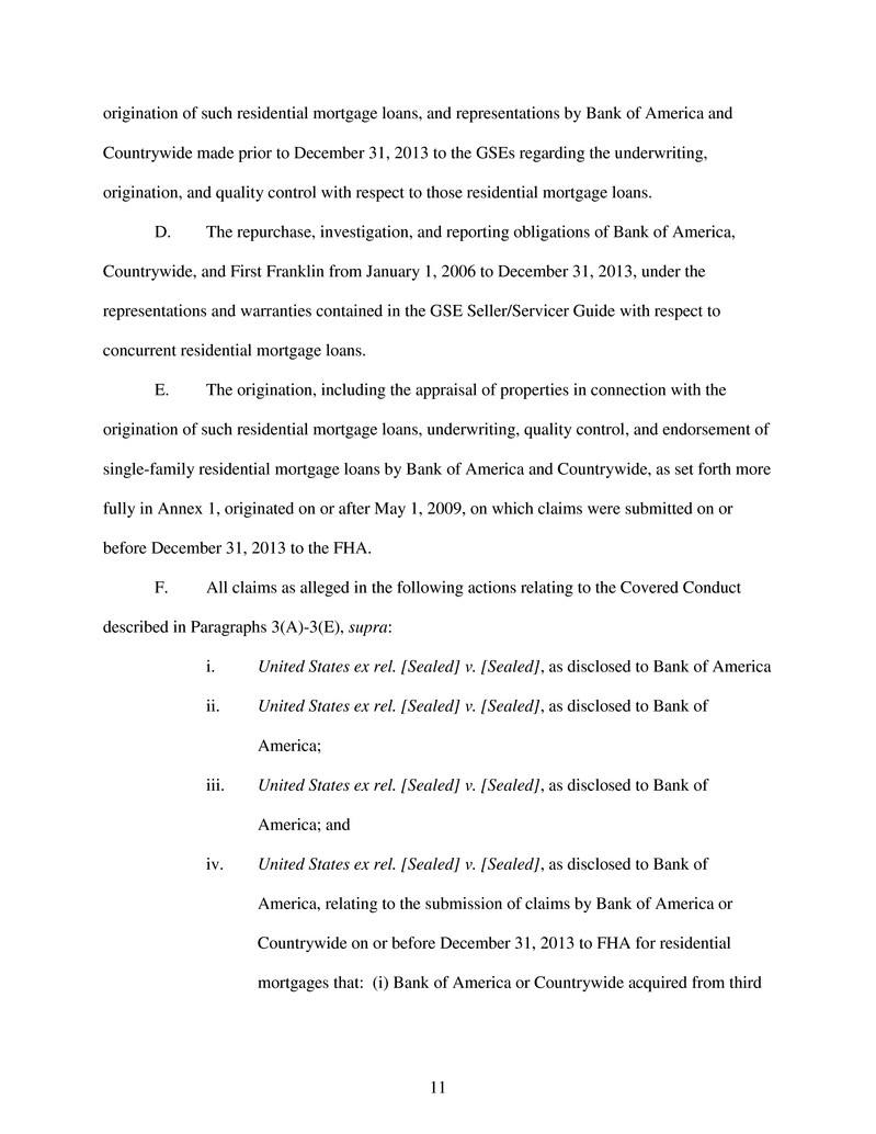 origination of such residential mortgage loans, and representations by Bank of America and Countrywide made prior to December 31, 2013 to the GSEs regarding the underwriting, origination, and quality control with respect to those residential mortgage loans. D. The repurchase, investigation, and reporting obligations of Bank of America, Countrywide, and First Franklin from January 1, 2006 to December 31, 2013, under the representations and warranties contained in the GSE Seller/Servicer Guide with respect to concurrent residential mortgage loans. E. The origination, including the appraisal of properties in connection with the origination of such residential mortgage loans, underwriting, quality control, and endorsement of single-family residential mortgage loans by Bank of America and Countrywide, as set forth more fully in Annex 1, originated on or after May 1, 2009, on which claims were submitted on or before December 31, 2013 to the FHA. F. All claims as alleged in the following actions relating to the Covered Conduct described in Paragraphs 3(A)-3(E), supra: i. United States ex rel. [Sealed] v. [Sealed], as disclosed to Bank of America ii. United States ex rel. [Sealed] v. [Sealed], as disclosed to Bank of America; iii. United States ex rel. [Sealed] v. [Sealed], as disclosed to Bank of America; and iv. United States ex rel. [Sealed] v. [Sealed], as disclosed to Bank of America, relating to the submission of claims by Bank of America or Countrywide on or before December 31, 2013 to FHA for residential mortgages that: (i) Bank of America or Countrywide acquired from third 11