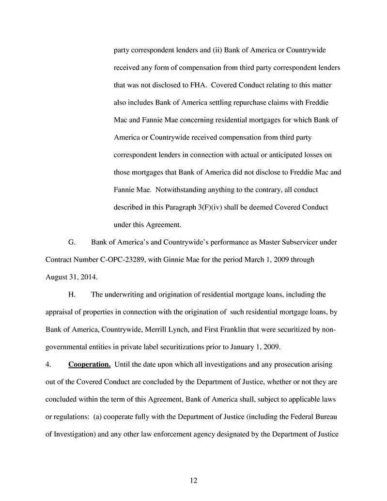 party correspondent lenders and (ii) Bank of America or Countrywide received any form of compensation from third party correspondent lenders that was not disclosed to FHA. Covered Conduct relating to this matter also includes Bank of America settling repurchase claims with Freddie Mac and Fannie Mae concerning residential mortgages for which Bank of America or Countrywide received compensation from third party correspondent lenders in connection with actual or anticipated losses on those mortgages that Bank of America did not disclose to Freddie Mac and Fannie Mae. Notwithstanding anything to the contrary, all conduct described in this Paragraph 3(F)(iv) shall be deemed Covered Conduct under this Agreement. G. Bank of America’s and Countrywide’s performance as Master Subservicer under Contract Number C-OPC-23289, with Ginnie Mae for the period March 1, 2009 through August 31, 2014. H. The underwriting and origination of residential mortgage loans, including the appraisal of properties in connection with the origination of such residential mortgage loans, by Bank of America, Countrywide, Merrill Lynch, and First Franklin that were securitized by non- governmental entities in private label securitizations prior to January 1, 2009. 4. Cooperation. Until the date upon which all investigations and any prosecution arising out of the Covered Conduct are concluded by the Department of Justice, whether or not they are concluded within the term of this Agreement, Bank of America shall, subject to applicable laws or regulations: (a) cooperate fully with the Department of Justice (including the Federal Bureau of Investigation) and any other law enforcement agency designated by the Department of Justice 12