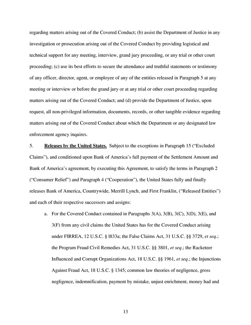 regarding matters arising out of the Covered Conduct; (b) assist the Department of Justice in any investigation or prosecution arising out of the Covered Conduct by providing logistical and technical support for any meeting, interview, grand jury proceeding, or any trial or other court proceeding; (c) use its best efforts to secure the attendance and truthful statements or testimony of any officer, director, agent, or employee of any of the entities released in Paragraph 5 at any meeting or interview or before the grand jury or at any trial or other court proceeding regarding matters arising out of the Covered Conduct; and (d) provide the Department of Justice, upon request, all non-privileged information, documents, records, or other tangible evidence regarding matters arising out of the Covered Conduct about which the Department or any designated law enforcement agency inquires. 5. Releases by the United States. Subject to the exceptions in Paragraph 15 (“Excluded Claims”), and conditioned upon Bank of America’s full payment of the Settlement Amount and Bank of America’s agreement, by executing this Agreement, to satisfy the terms in Paragraph 2 (“Consumer Relief”) and Paragraph 4 (“Cooperation”), the United States fully and finally releases Bank of America, Countrywide, Merrill Lynch, and First Franklin, (“Released Entities”) and each of their respective successors and assigns: a. For the Covered Conduct contained in Paragraphs 3(A), 3(B), 3(C), 3(D), 3(E), and 3(F) from any civil claims the United States has for the Covered Conduct arising under FIRREA, 12 U.S.C. § l833a; the False Claims Act, 31 U.S.C. §§ 3729, et seq.; the Program Fraud Civil Remedies Act, 31 U.S.C. §§ 3801, et seq.; the Racketeer Influenced and Corrupt Organizations Act, 18 U.S.C. §§ 1961, et seq.; the Injunctions Against Fraud Act, 18 U.S.C. § 1345; common law theories of negligence, gross negligence, indemnification, payment by mistake, unjust enrichment, money had and 13
