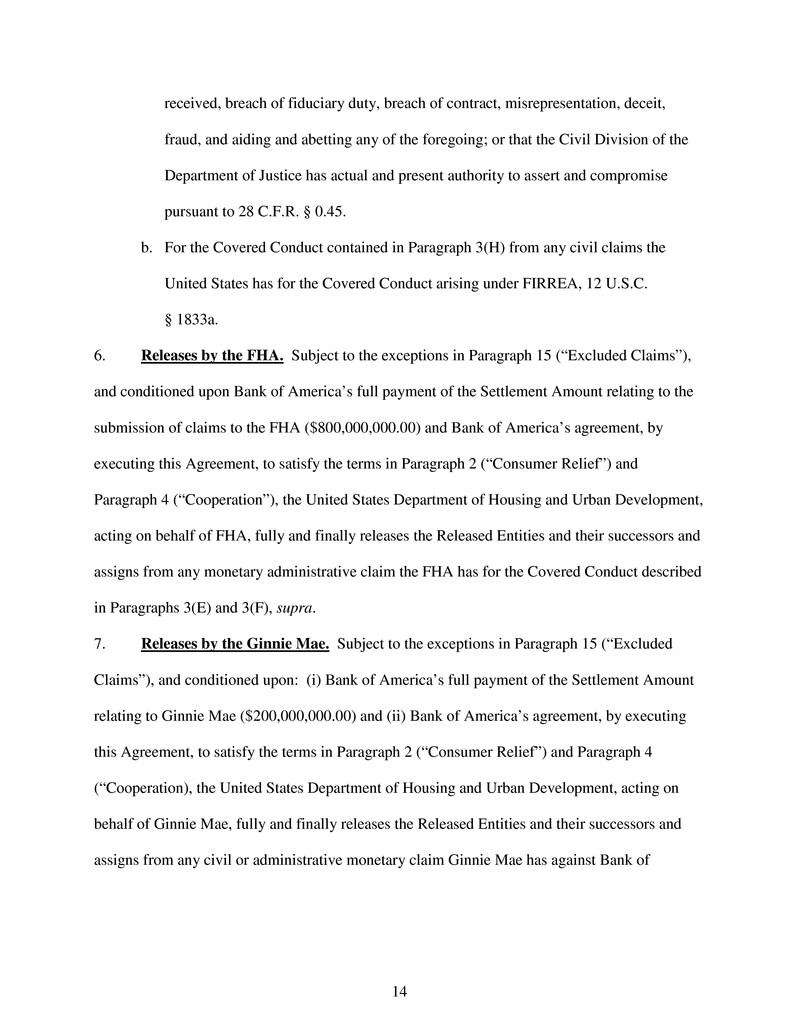 received, breach of fiduciary duty, breach of contract, misrepresentation, deceit, fraud, and aiding and abetting any of the foregoing; or that the Civil Division of the Department of Justice has actual and present authority to assert and compromise pursuant to 28 C.F.R. § 0.45. b. For the Covered Conduct contained in Paragraph 3(H) from any civil claims the United States has for the Covered Conduct arising under FIRREA, 12 U.S.C. § 1833a. 6. Releases by the FHA. Subject to the exceptions in Paragraph 15 (“Excluded Claims”), and conditioned upon Bank of America’s full payment of the Settlement Amount relating to the submission of claims to the FHA ($800,000,000.00) and Bank of America’s agreement, by executing this Agreement, to satisfy the terms in Paragraph 2 (“Consumer Relief”) and Paragraph 4 (“Cooperation”), the United States Department of Housing and Urban Development, acting on behalf of FHA, fully and finally releases the Released Entities and their successors and assigns from any monetary administrative claim the FHA has for the Covered Conduct described in Paragraphs 3(E) and 3(F), supra. 7. Releases by the Ginnie Mae. Subject to the exceptions in Paragraph 15 (“Excluded Claims”), and conditioned upon: (i) Bank of America’s full payment of the Settlement Amount relating to Ginnie Mae ($200,000,000.00) and (ii) Bank of America’s agreement, by executing this Agreement, to satisfy the terms in Paragraph 2 (“Consumer Relief”) and Paragraph 4 (“Cooperation), the United States Department of Housing and Urban Development, acting on behalf of Ginnie Mae, fully and finally releases the Released Entities and their successors and assigns from any civil or administrative monetary claim Ginnie Mae has against Bank of 14
