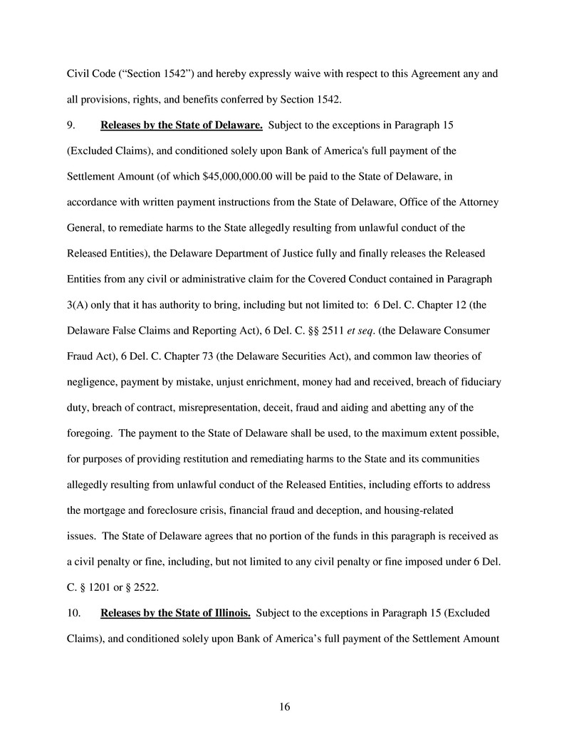 Civil Code (“Section 1542”) and hereby expressly waive with respect to this Agreement any and all provisions, rights, and benefits conferred by Section 1542. 9. Releases by the State of Delaware. Subject to the exceptions in Paragraph 15 (Excluded Claims), and conditioned solely upon Bank of America's full payment of the Settlement Amount (of which $45,000,000.00 will be paid to the State of Delaware, in accordance with written payment instructions from the State of Delaware, Office of the Attorney General, to remediate harms to the State allegedly resulting from unlawful conduct of the Released Entities), the Delaware Department of Justice fully and finally releases the Released Entities from any civil or administrative claim for the Covered Conduct contained in Paragraph 3(A) only that it has authority to bring, including but not limited to: 6 Del. C. Chapter 12 (the Delaware False Claims and Reporting Act), 6 Del. C. §§ 2511 et seq. (the Delaware Consumer Fraud Act), 6 Del. C. Chapter 73 (the Delaware Securities Act), and common law theories of negligence, payment by mistake, unjust enrichment, money had and received, breach of fiduciary duty, breach of contract, misrepresentation, deceit, fraud and aiding and abetting any of the foregoing. The payment to the State of Delaware shall be used, to the maximum extent possible, for purposes of providing restitution and remediating harms to the State and its communities allegedly resulting from unlawful conduct of the Released Entities, including efforts to address the mortgage and foreclosure crisis, financial fraud and deception, and housing-related issues. The State of Delaware agrees that no portion of the funds in this paragraph is received as a civil penalty or fine, including, but not limited to any civil penalty or fine imposed under 6 Del. C. § 1201 or § 2522. 10. Releases by the State of Illinois. Subject to the exceptions in Paragraph 15 (Excluded Claims), and conditioned solely upon Bank of America’s full payment of the Settlement Amount 16
