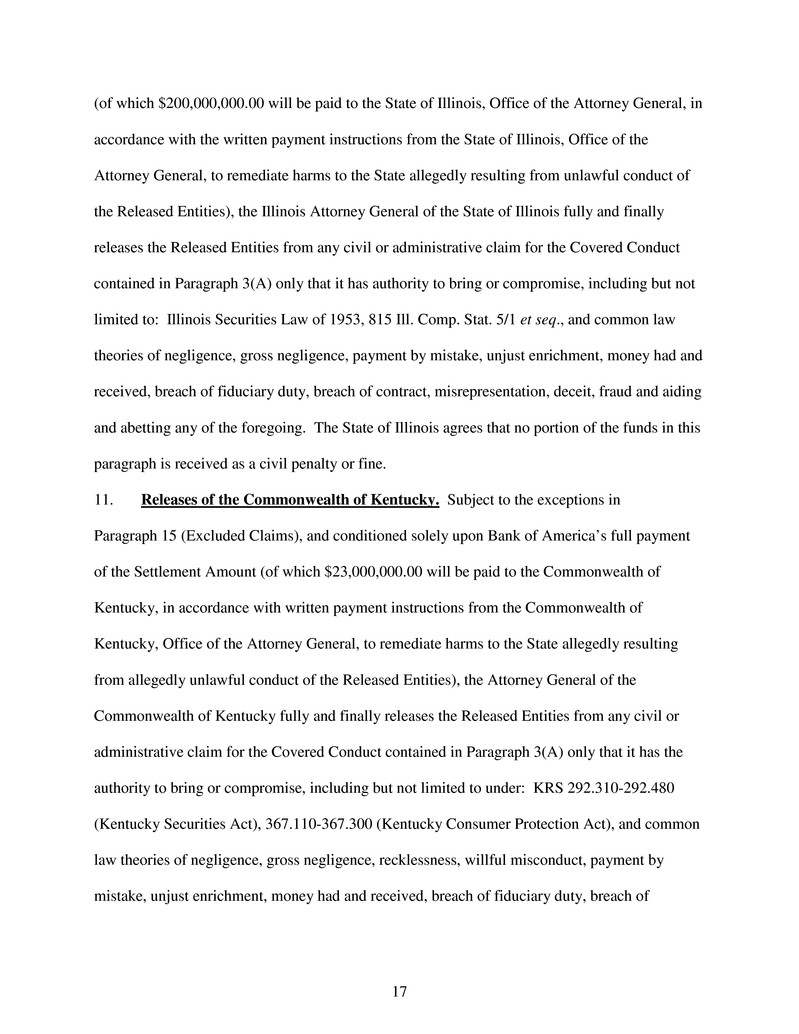 (of which $200,000,000.00 will be paid to the State of Illinois, Office of the Attorney General, in accordance with the written payment instructions from the State of Illinois, Office of the Attorney General, to remediate harms to the State allegedly resulting from unlawful conduct of the Released Entities), the Illinois Attorney General of the State of Illinois fully and finally releases the Released Entities from any civil or administrative claim for the Covered Conduct contained in Paragraph 3(A) only that it has authority to bring or compromise, including but not limited to: Illinois Securities Law of 1953, 815 Ill. Comp. Stat. 5/1 et seq., and common law theories of negligence, gross negligence, payment by mistake, unjust enrichment, money had and received, breach of fiduciary duty, breach of contract, misrepresentation, deceit, fraud and aiding and abetting any of the foregoing. The State of Illinois agrees that no portion of the funds in this paragraph is received as a civil penalty or fine. 11. Releases of the Commonwealth of Kentucky. Subject to the exceptions in Paragraph 15 (Excluded Claims), and conditioned solely upon Bank of America’s full payment of the Settlement Amount (of which $23,000,000.00 will be paid to the Commonwealth of Kentucky, in accordance with written payment instructions from the Commonwealth of Kentucky, Office of the Attorney General, to remediate harms to the State allegedly resulting from allegedly unlawful conduct of the Released Entities), the Attorney General of the Commonwealth of Kentucky fully and finally releases the Released Entities from any civil or administrative claim for the Covered Conduct contained in Paragraph 3(A) only that it has the authority to bring or compromise, including but not limited to under: KRS 292.310-292.480 (Kentucky Securities Act), 367.110-367.300 (Kentucky Consumer Protection Act), and common law theories of negligence, gross negligence, recklessness, willful misconduct, payment by mistake, unjust enrichment, money had and received, breach of fiduciary duty, breach of 17