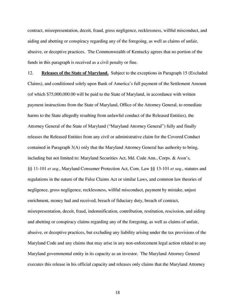 contract, misrepresentation, deceit, fraud, gross negligence, recklessness, willful misconduct, and aiding and abetting or conspiracy regarding any of the foregoing, as well as claims of unfair, abusive, or deceptive practices. The Commonwealth of Kentucky agrees that no portion of the funds in this paragraph is received as a civil penalty or fine. 12. Releases of the State of Maryland. Subject to the exceptions in Paragraph 15 (Excluded Claims), and conditioned solely upon Bank of America’s full payment of the Settlement Amount (of which $75,000,000.00 will be paid to the State of Maryland, in accordance with written payment instructions from the State of Maryland, Office of the Attorney General, to remediate harms to the State allegedly resulting from unlawful conduct of the Released Entities), the Attorney General of the State of Maryland (“Maryland Attorney General”) fully and finally releases the Released Entities from any civil or administrative claim for the Covered Conduct contained in Paragraph 3(A) only that the Maryland Attorney General has authority to bring, including but not limited to: Maryland Securities Act, Md. Code Ann., Corps. & Assn’s, §§ 11-101 et seq., Maryland Consumer Protection Act, Com. Law §§ 13-101 et seq., statutes and regulations in the nature of the False Claims Act or similar Laws, and common law theories of negligence, gross negligence, recklessness, willful misconduct, payment by mistake, unjust enrichment, money had and received, breach of fiduciary duty, breach of contract, misrepresentation, deceit, fraud, indemnification, contribution, restitution, rescission, and aiding and abetting or conspiracy claims regarding any of the foregoing, as well as claims of unfair, abusive, or deceptive practices, but excluding any liability arising under the tax provisions of the Maryland Code and any claims that may arise in any non-enforcement legal action related to any Maryland governmental entity in its capacity as an investor. The Maryland Attorney General executes this release in his official capacity and releases only claims that the Maryland Attorney 18