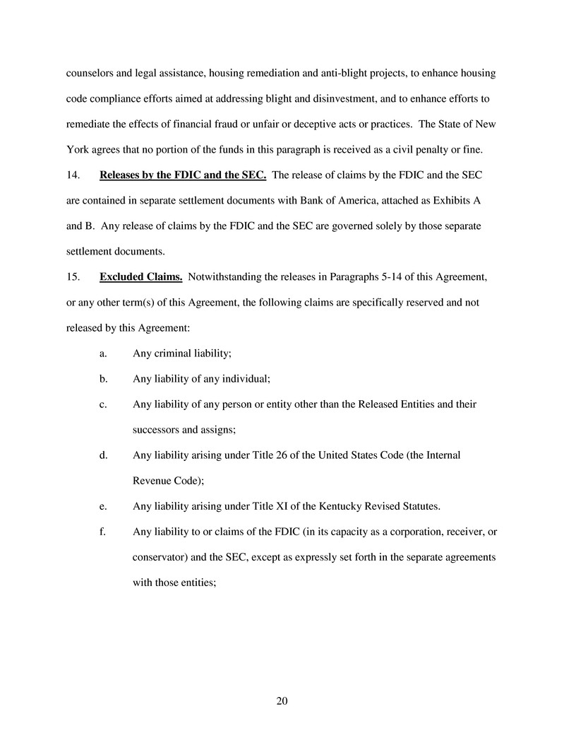 counselors and legal assistance, housing remediation and anti-blight projects, to enhance housing code compliance efforts aimed at addressing blight and disinvestment, and to enhance efforts to remediate the effects of financial fraud or unfair or deceptive acts or practices. The State of New York agrees that no portion of the funds in this paragraph is received as a civil penalty or fine. 14. Releases by the FDIC and the SEC. The release of claims by the FDIC and the SEC are contained in separate settlement documents with Bank of America, attached as Exhibits A and B. Any release of claims by the FDIC and the SEC are governed solely by those separate settlement documents. 15. Excluded Claims. Notwithstanding the releases in Paragraphs 5-14 of this Agreement, or any other term(s) of this Agreement, the following claims are specifically reserved and not released by this Agreement: a. Any criminal liability; b. Any liability of any individual; c. Any liability of any person or entity other than the Released Entities and their successors and assigns; d. Any liability arising under Title 26 of the United States Code (the Internal Revenue Code); e. Any liability arising under Title XI of the Kentucky Revised Statutes. f. Any liability to or claims of the FDIC (in its capacity as a corporation, receiver, or conservator) and the SEC, except as expressly set forth in the separate agreements with those entities; 20