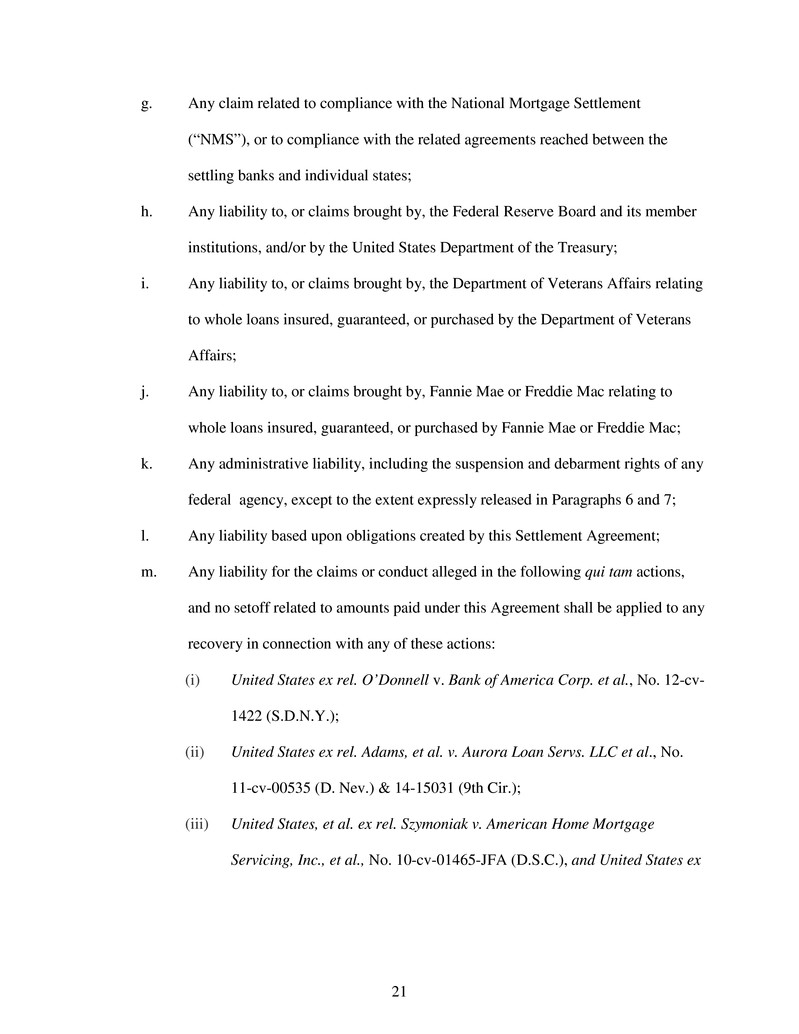 g. Any claim related to compliance with the National Mortgage Settlement (“NMS”), or to compliance with the related agreements reached between the settling banks and individual states; h. Any liability to, or claims brought by, the Federal Reserve Board and its member institutions, and/or by the United States Department of the Treasury; i. Any liability to, or claims brought by, the Department of Veterans Affairs relating to whole loans insured, guaranteed, or purchased by the Department of Veterans Affairs; j. Any liability to, or claims brought by, Fannie Mae or Freddie Mac relating to whole loans insured, guaranteed, or purchased by Fannie Mae or Freddie Mac; k. Any administrative liability, including the suspension and debarment rights of any federal agency, except to the extent expressly released in Paragraphs 6 and 7; l. Any liability based upon obligations created by this Settlement Agreement; m. Any liability for the claims or conduct alleged in the following qui tam actions, and no setoff related to amounts paid under this Agreement shall be applied to any recovery in connection with any of these actions: (i) United States ex rel. O’Donnell v. Bank of America Corp. et al., No. 12-cv- 1422 (S.D.N.Y.); (ii) United States ex rel. Adams, et al. v. Aurora Loan Servs. LLC et al., No. 11-cv-00535 (D. Nev.) & 14-15031 (9th Cir.); (iii) United States, et al. ex rel. Szymoniak v. American Home Mortgage Servicing, Inc., et al., No. 10-cv-01465-JFA (D.S.C.), and United States ex 21