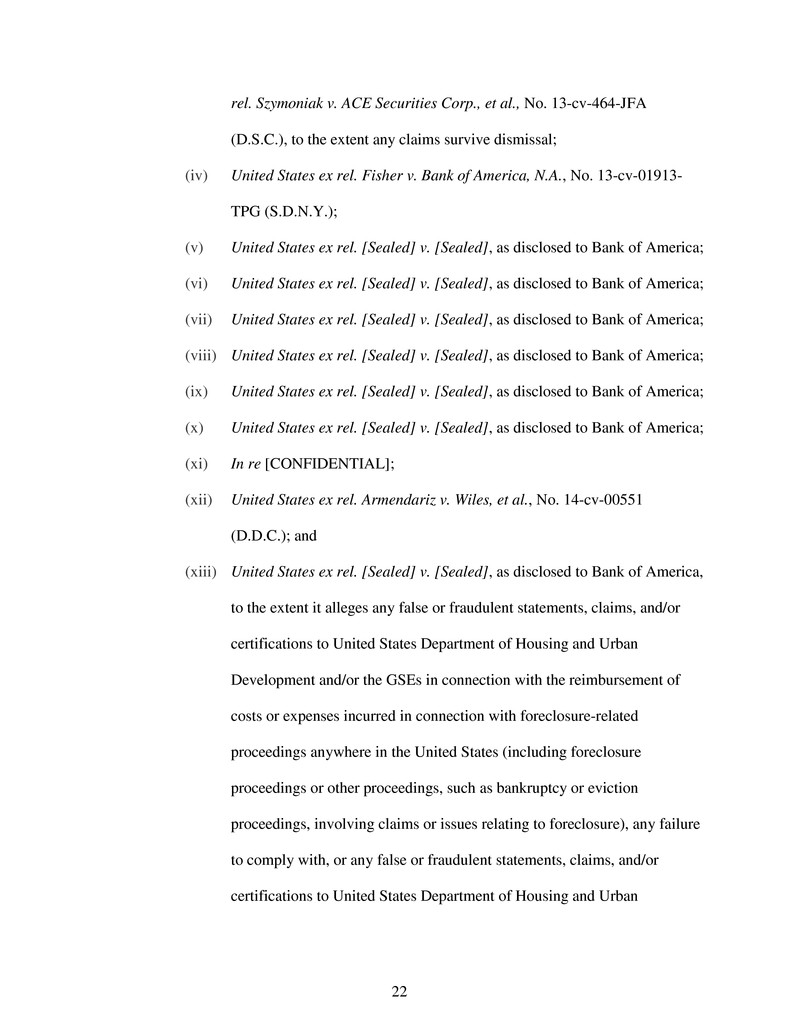rel. Szymoniak v. ACE Securities Corp., et al., No. 13-cv-464-JFA (D.S.C.), to the extent any claims survive dismissal; (iv) United States ex rel. Fisher v. Bank of America, N.A., No. 13-cv-01913- TPG (S.D.N.Y.); (v) United States ex rel. [Sealed] v. [Sealed], as disclosed to Bank of America; (vi) United States ex rel. [Sealed] v. [Sealed], as disclosed to Bank of America; (vii) United States ex rel. [Sealed] v. [Sealed], as disclosed to Bank of America; (viii) United States ex rel. [Sealed] v. [Sealed], as disclosed to Bank of America; (ix) United States ex rel. [Sealed] v. [Sealed], as disclosed to Bank of America; (x) United States ex rel. [Sealed] v. [Sealed], as disclosed to Bank of America; (xi) In re [CONFIDENTIAL]; (xii) United States ex rel. Armendariz v. Wiles, et al., No. 14-cv-00551 (D.D.C.); and (xiii) United States ex rel. [Sealed] v. [Sealed], as disclosed to Bank of America, to the extent it alleges any false or fraudulent statements, claims, and/or certifications to United States Department of Housing and Urban Development and/or the GSEs in connection with the reimbursement of costs or expenses incurred in connection with foreclosure-related proceedings anywhere in the United States (including foreclosure proceedings or other proceedings, such as bankruptcy or eviction proceedings, involving claims or issues relating to foreclosure), any failure to comply with, or any false or fraudulent statements, claims, and/or certifications to United States Department of Housing and Urban 22