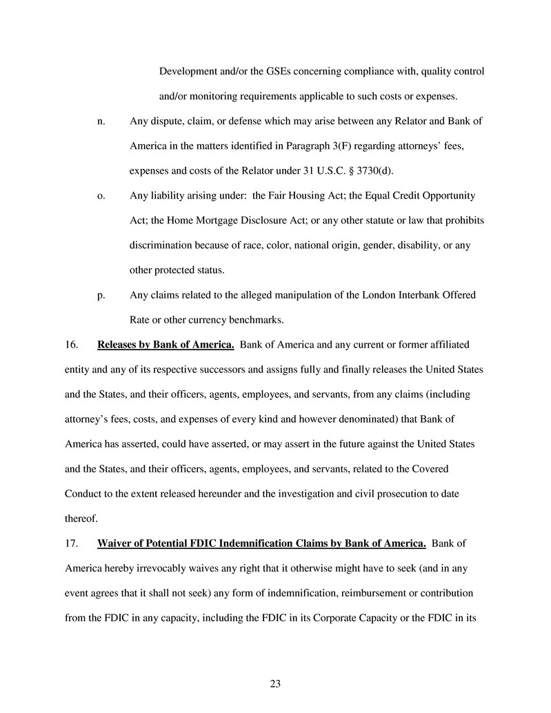 Development and/or the GSEs concerning compliance with, quality control and/or monitoring requirements applicable to such costs or expenses. n. Any dispute, claim, or defense which may arise between any Relator and Bank of America in the matters identified in Paragraph 3(F) regarding attorneys’ fees, expenses and costs of the Relator under 31 U.S.C. § 3730(d). o. Any liability arising under: the Fair Housing Act; the Equal Credit Opportunity Act; the Home Mortgage Disclosure Act; or any other statute or law that prohibits discrimination because of race, color, national origin, gender, disability, or any other protected status. p. Any claims related to the alleged manipulation of the London Interbank Offered Rate or other currency benchmarks. 16. Releases by Bank of America. Bank of America and any current or former affiliated entity and any of its respective successors and assigns fully and finally releases the United States and the States, and their officers, agents, employees, and servants, from any claims (including attorney’s fees, costs, and expenses of every kind and however denominated) that Bank of America has asserted, could have asserted, or may assert in the future against the United States and the States, and their officers, agents, employees, and servants, related to the Covered Conduct to the extent released hereunder and the investigation and civil prosecution to date thereof. 17. Waiver of Potential FDIC Indemnification Claims by Bank of America. Bank of America hereby irrevocably waives any right that it otherwise might have to seek (and in any event agrees that it shall not seek) any form of indemnification, reimbursement or contribution from the FDIC in any capacity, including the FDIC in its Corporate Capacity or the FDIC in its 23