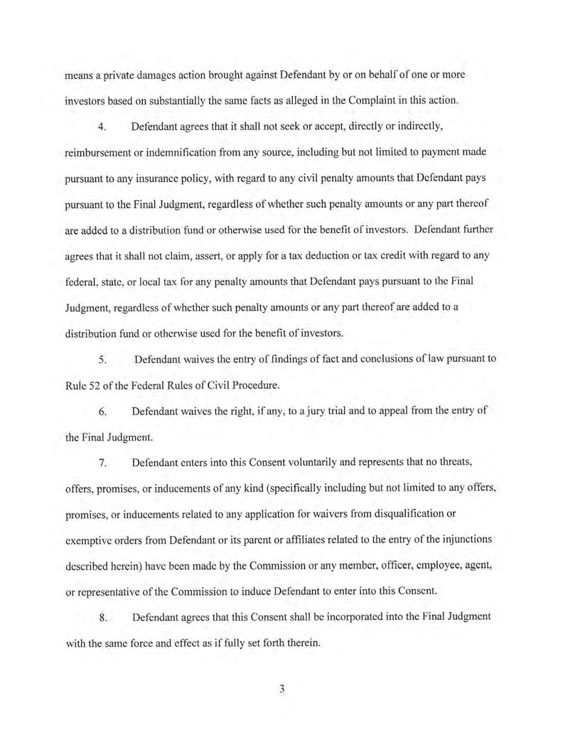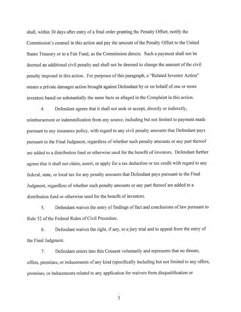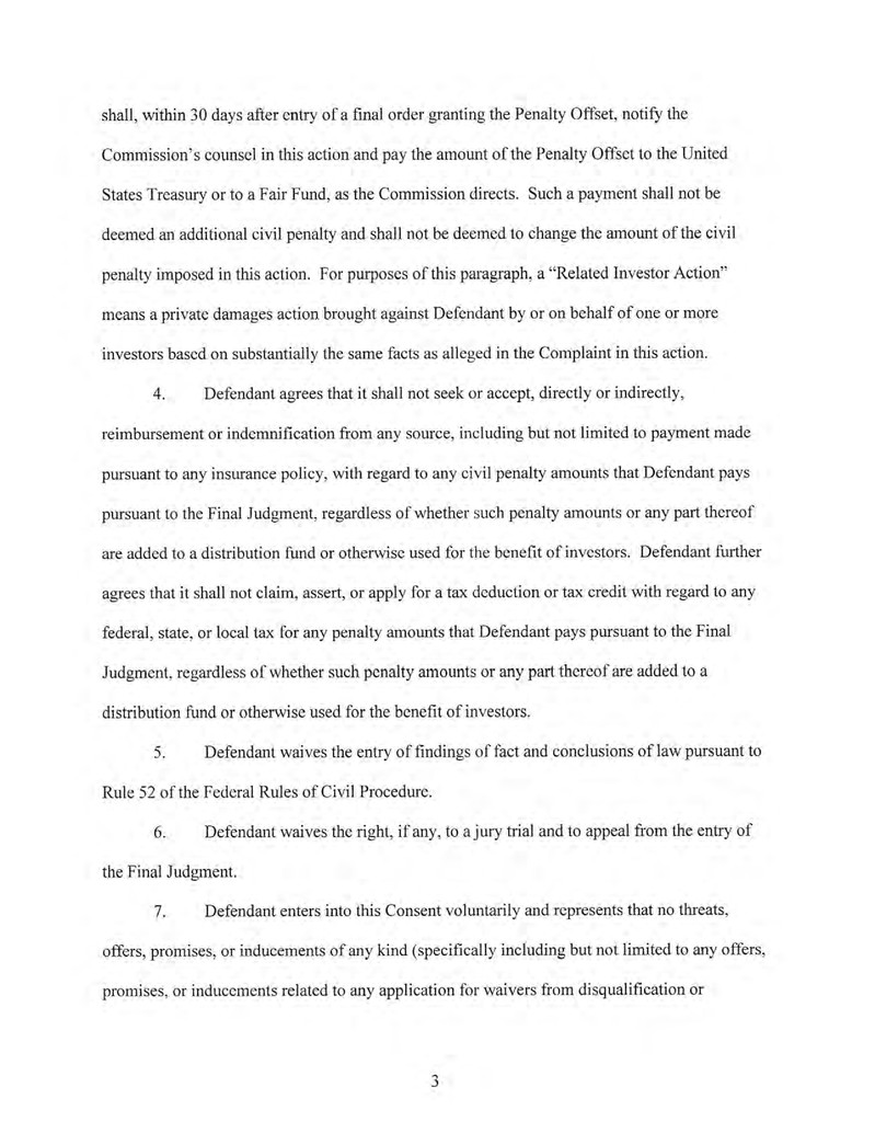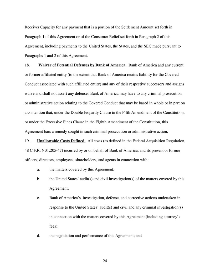 Receiver Capacity for any payment that is a portion of the Settlement Amount set forth in Paragraph 1 of this Agreement or of the Consumer Relief set forth in Paragraph 2 of this Agreement, including payments to the United States, the States, and the SEC made pursuant to Paragraphs 1 and 2 of this Agreement. 18. Waiver of Potential Defenses by Bank of America. Bank of America and any current or former affiliated entity (to the extent that Bank of America retains liability for the Covered Conduct associated with such affiliated entity) and any of their respective successors and assigns waive and shall not assert any defenses Bank of America may have to any criminal prosecution or administrative action relating to the Covered Conduct that may be based in whole or in part on a contention that, under the Double Jeopardy Clause in the Fifth Amendment of the Constitution, or under the Excessive Fines Clause in the Eighth Amendment of the Constitution, this Agreement bars a remedy sought in such criminal prosecution or administrative action. 19. Unallowable Costs Defined. All costs (as defined in the Federal Acquisition Regulation, 48 C.F.R. § 31.205-47) incurred by or on behalf of Bank of America, and its present or former officers, directors, employees, shareholders, and agents in connection with: a. the matters covered by this Agreement; b. the United States’ audit(s) and civil investigation(s) of the matters covered by this Agreement; c. Bank of America’s investigation, defense, and corrective actions undertaken in response to the United States’ audit(s) and civil and any criminal investigation(s) in connection with the matters covered by this Agreement (including attorney’s fees); d. the negotiation and performance of this Agreement; and 24