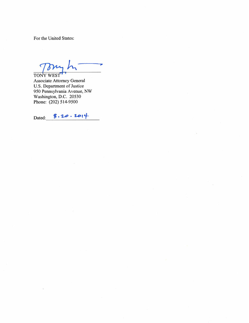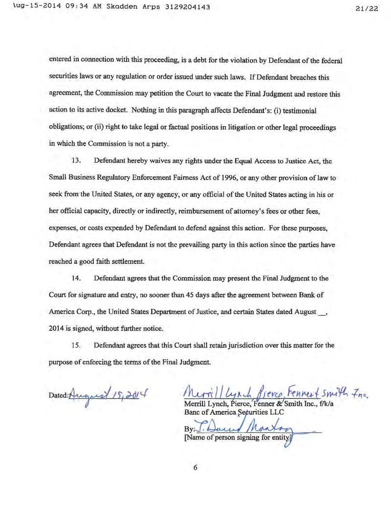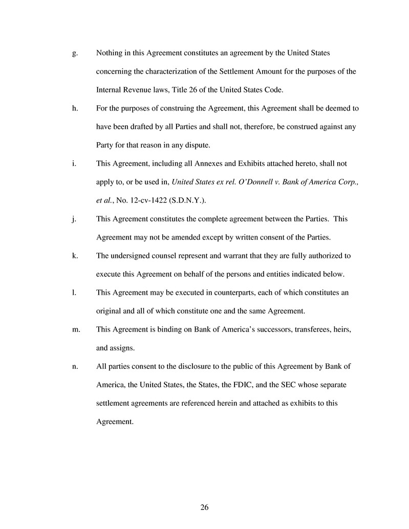 g. Nothing in this Agreement constitutes an agreement by the United States concerning the characterization of the Settlement Amount for the purposes of the Internal Revenue laws, Title 26 of the United States Code. h. For the purposes of construing the Agreement, this Agreement shall be deemed to have been drafted by all Parties and shall not, therefore, be construed against any Party for that reason in any dispute. i. This Agreement, including all Annexes and Exhibits attached hereto, shall not apply to, or be used in, United States ex rel. O’Donnell v. Bank of America Corp., et al., No. 12-cv-1422 (S.D.N.Y.). j. This Agreement constitutes the complete agreement between the Parties. This Agreement may not be amended except by written consent of the Parties. k. The undersigned counsel represent and warrant that they are fully authorized to execute this Agreement on behalf of the persons and entities indicated below. l. This Agreement may be executed in counterparts, each of which constitutes an original and all of which constitute one and the same Agreement. m. This Agreement is binding on Bank of America’s successors, transferees, heirs, and assigns. n. All parties consent to the disclosure to the public of this Agreement by Bank of America, the United States, the States, the FDIC, and the SEC whose separate settlement agreements are referenced herein and attached as exhibits to this Agreement. 26
