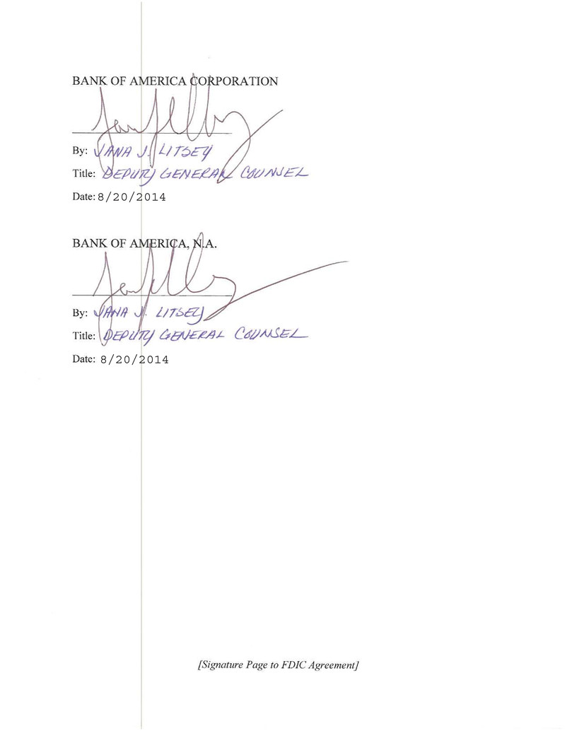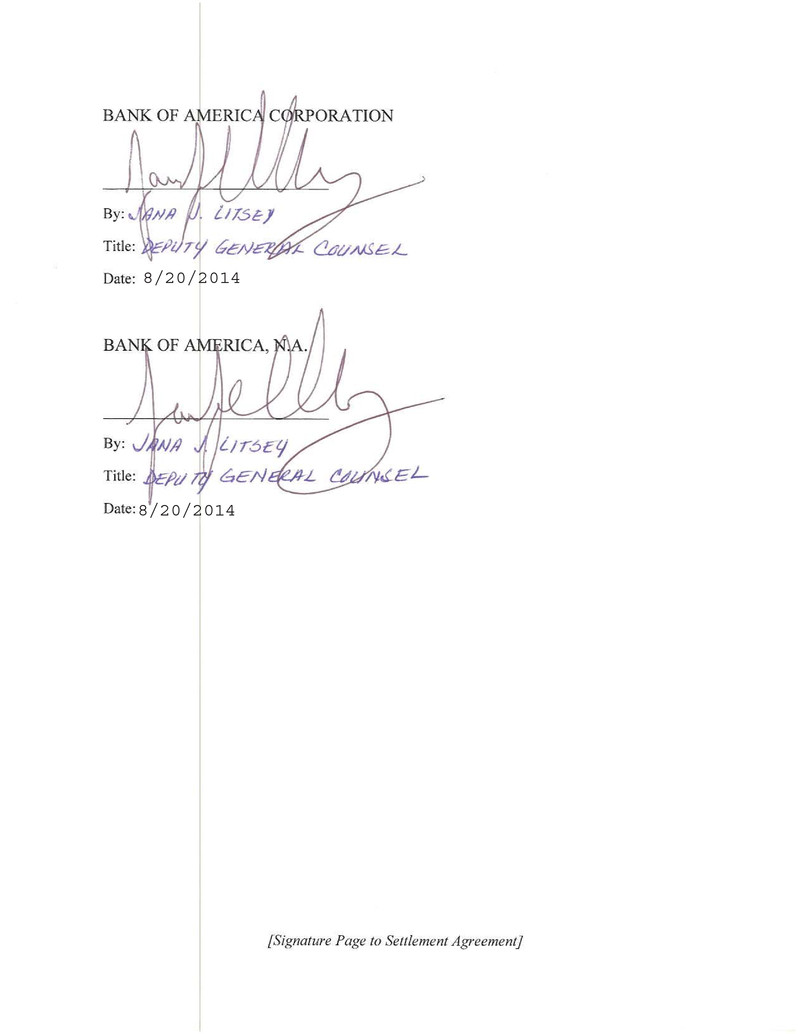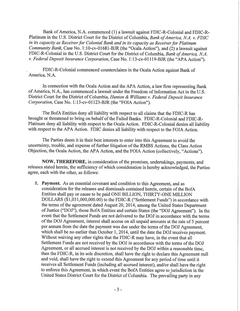 Bank of America, N.A. commenced (1) a lawsuit against FDIC-R-Colonial and FDIC-R- Platinum in the U.S. District Court for the District of Columbia, Bank ofAmerica, N.A. v. FDIC in its capacity as Receiver for Colonial Bank and in its capacity as Receiver for Platinum Community Bank, Case No. 1:10-cv-01681-BJR (the "Ocala Action"), and (2) a lawsuit against FDIC-R-Colonial in the U.S. District Court for the District of Columbia, Bank ofAmerica, N.A. v. Federal Deposit Insurance Corporation, Case No. 1:13-cv-01119-BJR (the "APA Action"). FDIC-R-Colonial commenced counterclaims in the Ocala Action against Bank of America, N.A. In connection with the Ocala Action and the APA Action, a law firm representing Bank of America, N.A., has commenced a lawsuit under the Freedom of Information Act in the U.S. District Court for the District of Columbia, Hunton &Williams v. Federal Deposit Insurance Corporation, Case No. 1:13-cv-Ol 123-BJR (the "FOIA Action"). The BofA Entities deny all liability with respect to all claims that the FDIC-R has brought or threatened to bring on behalf of the Failed Banks. FDIC-R-Colonial and FDIC-R- Platinum deny all liability with respect to the Ocala Action. FDIC-R-Colonial denies all liability with respect to the APA Action. FDIC denies all liability with respect to the FOIA Action. The Parties deem it in their best interests to enter into this Agreement to avoid the uncertainty, trouble, and expense of further litigation of the RMBS Actions, the Class Action Objection, the Ocala Action, the APA Action, and the FOIA Action (collectively, "Actions"). NOW, THEREFORE, in consideration of the promises, undertakings, payments, and releases stated herein, the sufficiency of which consideration is hereby acknowledged, the Parties agree, each with the other, as follows: 1. Payment. As an essential covenant and condition to this Agreement, and as consideration for the releases and dismissals contained herein, certain of the BofA Entities shall pay or cause to be paid ONE BILLION, THIRTY-ONE MILLION DOLLARS ($1,031,000,000.00) to the FDIC-R ("Settlement Funds") in accordance with the terms of the agreement dated August 20, 2014, among the United States Department of Justice ("DOJ"), those BofA Entities and certain States (the "DOJ Agreement"). In the event that the Settlement Funds are not delivered to the DOJ in accordance with the terms of the DOJ Agreement, interest shall accrue on all unpaid amounts at the rate of 5 percent per annum from the date the payment was due under the terms of the DOJ Agreement, which shall be no earlier than October 1, 2014, until the date the DOJ receives payment. Without waiving any other rights that the FDIC-R may have, in the event that all Settlement Funds are not received by the DOJ in accordance with the terms of the DOJ Agreement, or all accrued interest is not received by the DOJ within a reasonable time, then the FDIC-R, in its sole discretion, shall have the right to declare this Agreement null and void, shall have the right to extend this Agreement for any period of time until it receives all Settlement Funds (including all accrued interest), and/or shall have the right to enforce this Agreement, in which event the BofA Entities agree to jurisdiction in the United States District Court for the District of Columbia. The prevailing party in any -3-