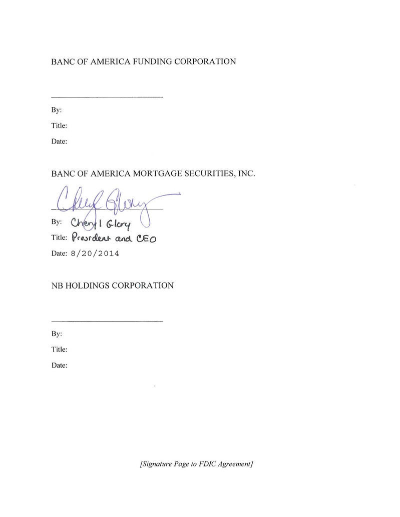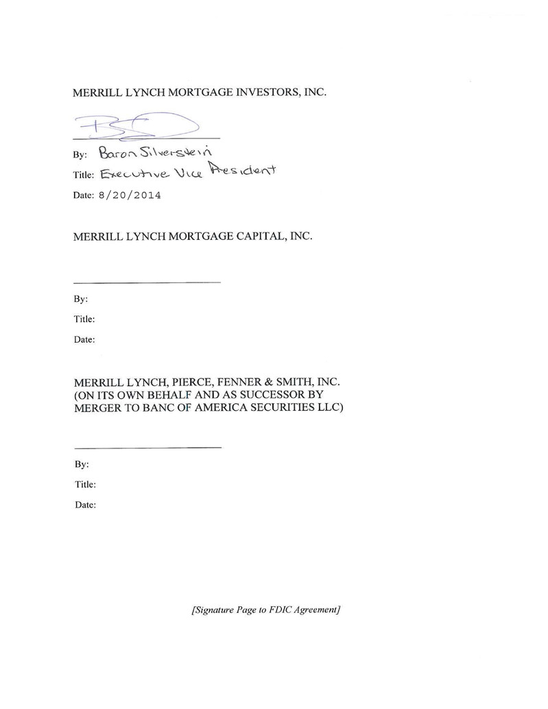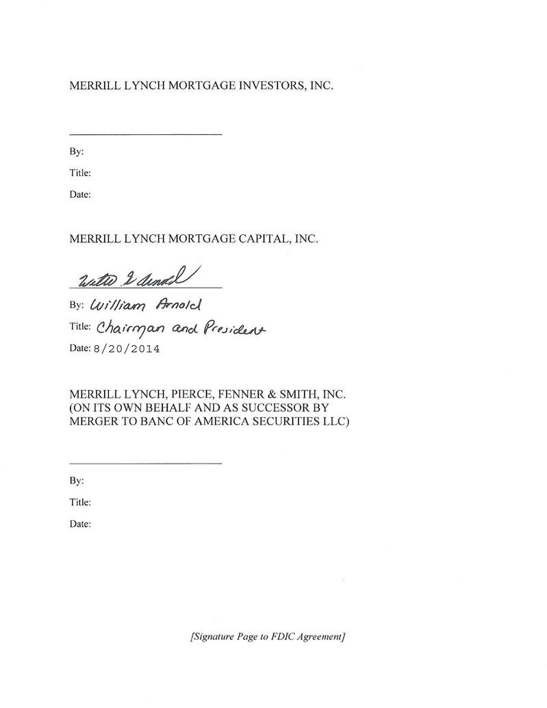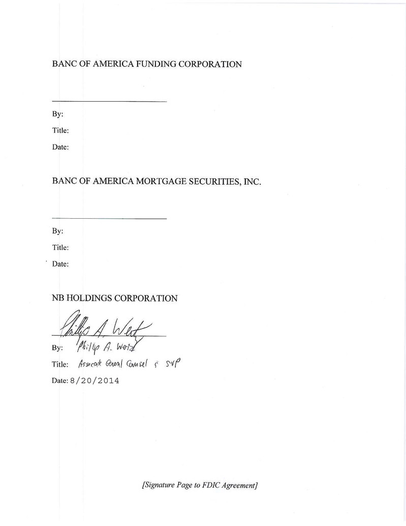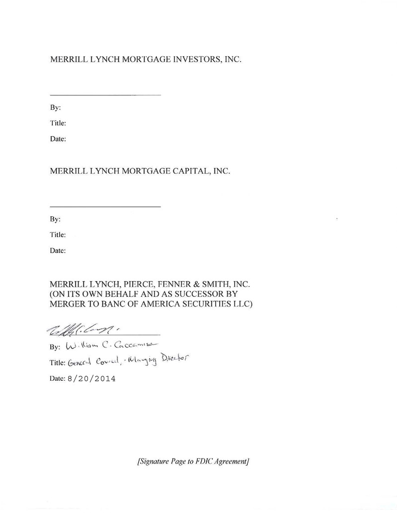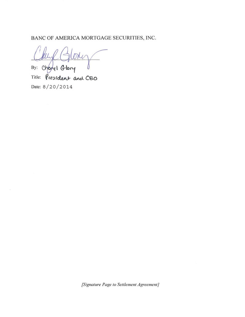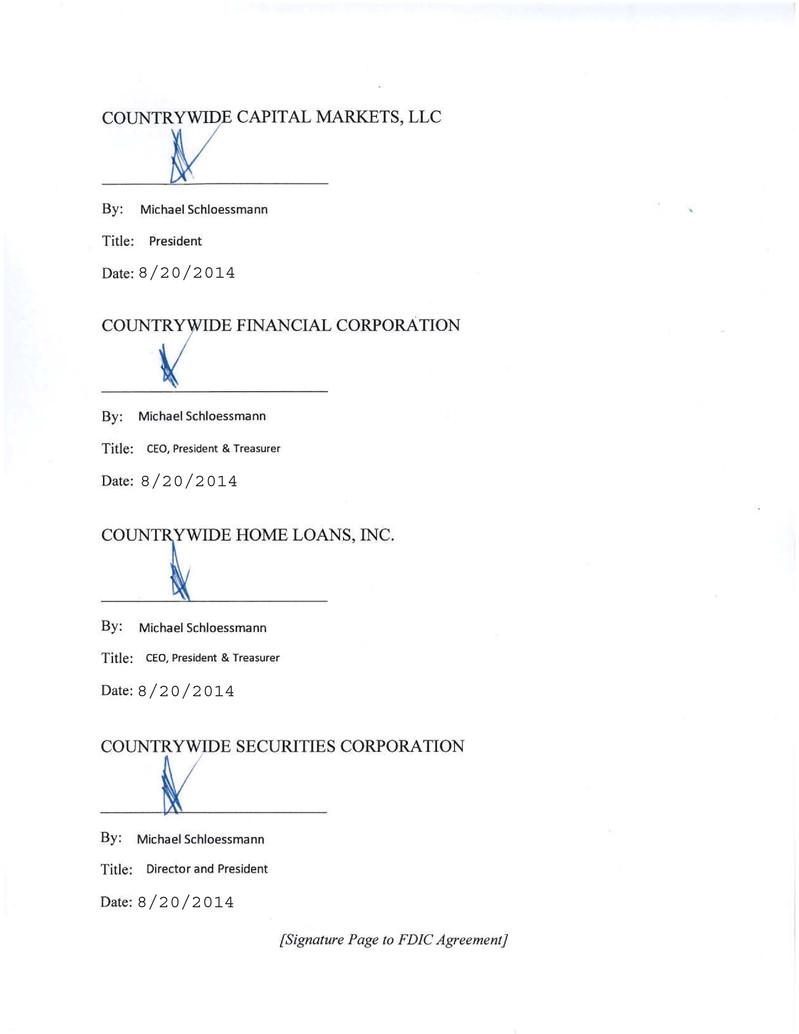 E. The United States Attorney’s Office for the Eastern District of New York has conducted an investigation of Bank of America’s origination of loans insured by the FHA from May 1, 2009 through March 31, 2012. F. The United States Department of Housing and Urban Development has conducted an investigation of Bank of America’s performance as Master Subservicer under Contract Number C-OPC-23289 with the Government National Mortgage Association (“Ginnie Mae”). G. Bank of America, Countrywide, Merrill Lynch, and/or certain affiliates thereof have resolved claims filed by the Federal Deposit Insurance Corporation (“FDIC”) as Receiver for 1st Pacific Bank of California, the FDIC as Receiver for Affinity Bank, the FDIC as Receiver for CF Bancorp, the FDIC as Receiver for Citizens National Bank, the FDIC as Receiver for Colonial Bank, the FDIC as Receiver for Eurobank, the FDIC as Receiver for First Banking Center, the FDIC as Receiver for First Dupage Bank, the FDIC as Receiver for Franklin Bank, S.S.B., the FDIC as Receiver for Guaranty Bank, the FDIC as Receiver for Horizon Bank, the FDIC as Receiver for Imperial Capital Bank, the FDIC as Receiver for Independent Bankers Bank, the FDIC as Receiver for Los Padres Bank, the FDIC as Receiver for Palos Bank & Trust Co., the FDIC as Receiver for Prosperan Bank, the FDIC as Receiver for SCB Bank, the FDIC as Receiver for Security Savings Bank, the FDIC as Receiver for ShoreBank, the FDIC as Receiver for Statewide Bank, the FDIC as Receiver for Strategic Capital Bank, the FDIC as Receiver for United Western Bank, F.S.B., the FDIC as Receiver for USA Bank, the FDIC as Receiver for Venture Bank, and the FDIC as Receiver for Warren Bank (the FDIC in its capacity as receiver for each of the Failed Banks referred to as “FDIC-R”), and claims filed by Bank of America, N.A. The terms of the resolution of those claims are memorialized in a separate agreement, attached hereto as Exhibit A. 4