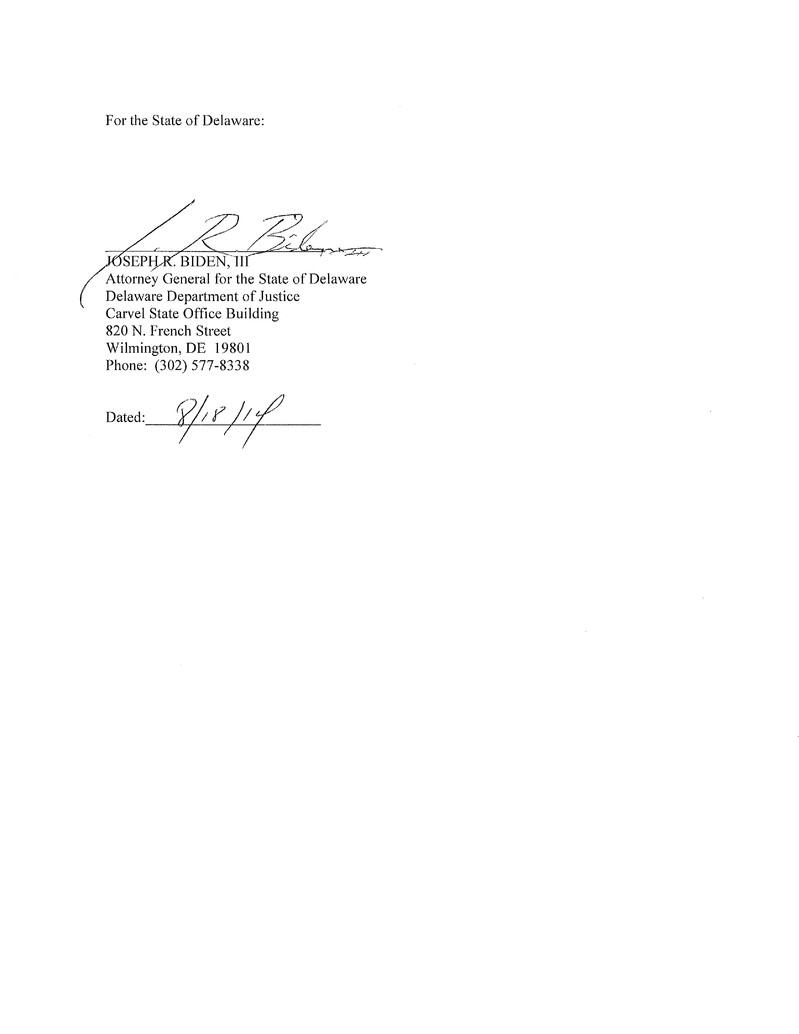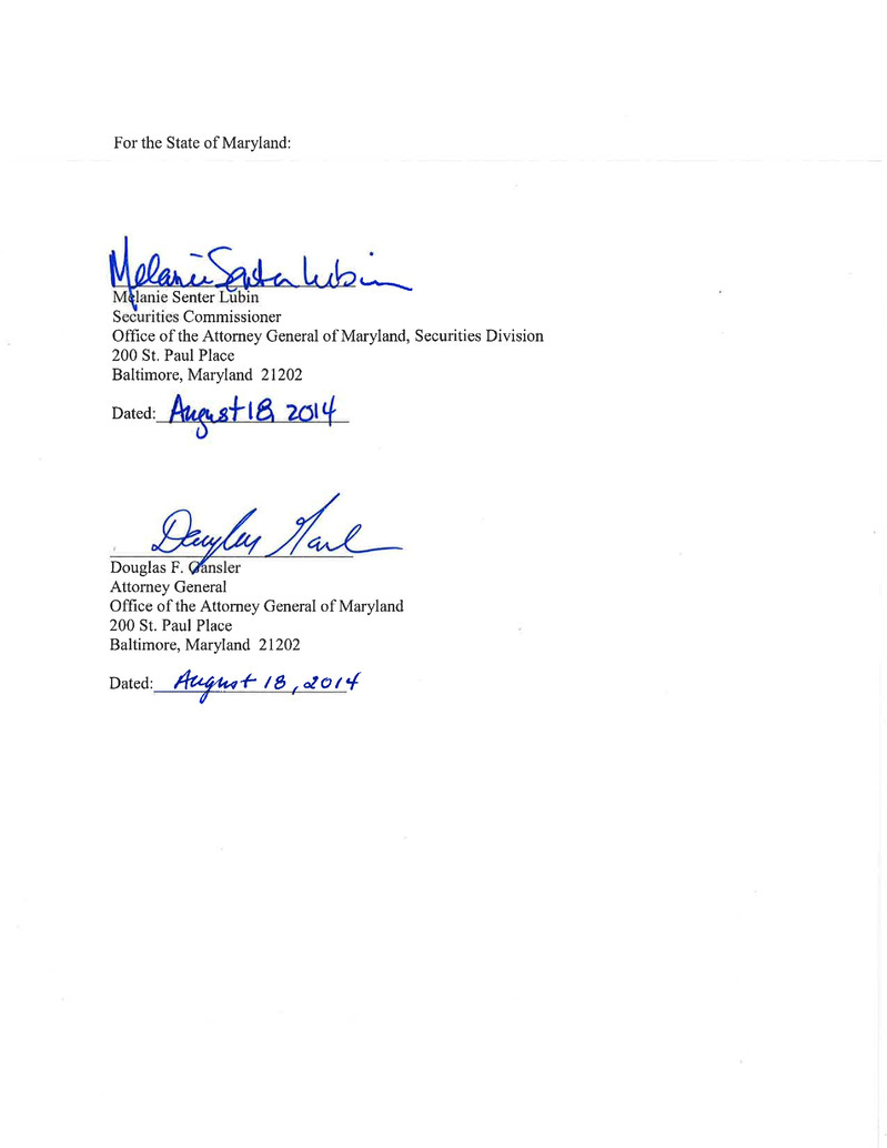 For the State of Maryland: Senter S Commissioner Office of the Attorney General of Maryland, Securities Division 200 St, Paul Place Baltimore, Maryland 21202 Dated Douglas F Attorney General Office of the Attomey General of Maryland 200 St. Paul Place Baltimore, Maryland 21202 Dared: 4t C.øt+ t8,"2ot{ I (