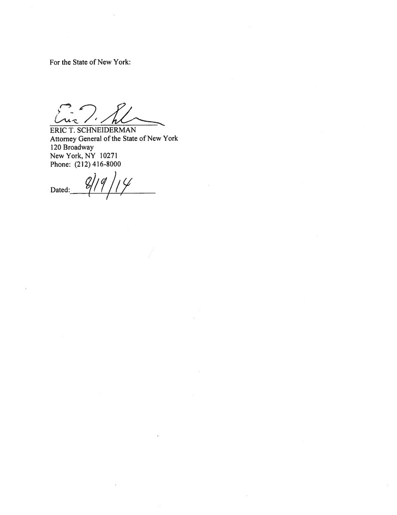 General has the authority to release for the Covered Conduct. The payment to the State of Maryland shall be made to the Maryland Attorney General, which shall hold the monies and distribute them as directed by the Maryland Attorney General for restitution to certain investors, including state and local governmental entities, and for costs incurred in connection with restitution, with any remaining funds to be credited to the Mortgage Loan Servicing Practices Settlement Fund to be used in accordance with Maryland law. The State of Maryland agrees that no portion of the funds in this paragraph is received as a civil penalty or fine. 13. Releases by the State of New York. Subject to the exceptions in Paragraph 15 (Excluded Claims), and conditioned solely upon Bank of America’s full payment of the Settlement Amount (of which $300,000,000.00 will be paid to the State of New York, in accordance with written payment instructions from the State of New York, Office of the Attorney General, to remediate harms to the State allegedly resulting from unlawful conduct of the Released Entities), the State of New York, by Eric T. Schneiderman, Attorney General of the State of New York, fully and finally releases the Released Entities from any civil or administrative claim for the Covered Conduct contained in Paragraph 3(A) only that it has authority to bring, including but not limited to any such claim under: New York General Business Law Article 23A, New York Executive Law § 63(12), and common law theories of negligence, payment by mistake, unjust enrichment, money had and received, breach of fiduciary duty, breach of contract, misrepresentation, deceit, fraud and aiding and abetting any of the foregoing. The payment to the State of New York shall be used, to the maximum extent possible, for purposes of redeveloping and revitalizing housing and home ownership and rebuilding communities in the State, and for programs intended to avoid preventable foreclosures, to ameliorate the effects of the foreclosure crisis, to provide funding for housing 19