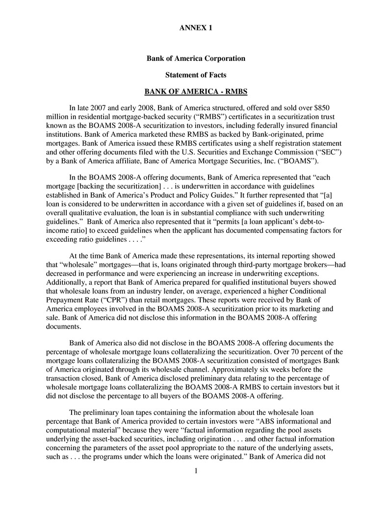 ANNEX 1 Bank of America Corporation Statement of Facts BANK OF AMERICA - RMBS In late 2007 and early 2008, Bank of America structured, offered and sold over $850 million in residential mortgage-backed security (“RMBS”) certificates in a securitization trust known as the BOAMS 2008-A securitization to investors, including federally insured financial institutions. Bank of America marketed these RMBS as backed by Bank-originated, prime mortgages. Bank of America issued these RMBS certificates using a shelf registration statement and other offering documents filed with the U.S. Securities and Exchange Commission (“SEC”) by a Bank of America affiliate, Banc of America Mortgage Securities, Inc. (“BOAMS”). In the BOAMS 2008-A offering documents, Bank of America represented that “each mortgage [backing the securitization] . . . is underwritten in accordance with guidelines established in Bank of America’s Product and Policy Guides.” It further represented that “[a] loan is considered to be underwritten in accordance with a given set of guidelines if, based on an overall qualitative evaluation, the loan is in substantial compliance with such underwriting guidelines.” Bank of America also represented that it “permits [a loan applicant’s debt-to- income ratio] to exceed guidelines when the applicant has documented compensating factors for exceeding ratio guidelines . . . .” At the time Bank of America made these representations, its internal reporting showed that “wholesale” mortgages—that is, loans originated through third-party mortgage brokers—had decreased in performance and were experiencing an increase in underwriting exceptions. Additionally, a report that Bank of America prepared for qualified institutional buyers showed that wholesale loans from an industry lender, on average, experienced a higher Conditional Prepayment Rate (“CPR”) than retail mortgages. These reports were received by Bank of America employees involved in the BOAMS 2008-A securitization prior to its marketing and sale. Bank of America did not disclose this information in the BOAMS 2008-A offering documents. Bank of America also did not disclose in the BOAMS 2008-A offering documents the percentage of wholesale mortgage loans collateralizing the securitization. Over 70 percent of the mortgage loans collateralizing the BOAMS 2008-A securitization consisted of mortgages Bank of America originated through its wholesale channel. Approximately six weeks before the transaction closed, Bank of America disclosed preliminary data relating to the percentage of wholesale mortgage loans collateralizing the BOAMS 2008-A RMBS to certain investors but it did not disclose the percentage to all buyers of the BOAMS 2008-A offering. The preliminary loan tapes containing the information about the wholesale loan percentage that Bank of America provided to certain investors were “ABS informational and computational material” because they were “factual information regarding the pool assets underlying the asset-backed securities, including origination . . . and other factual information concerning the parameters of the asset pool appropriate to the nature of the underlying assets, such as . . . the programs under which the loans were originated.” Bank of America did not 1