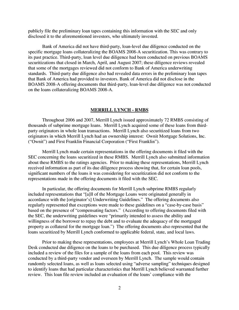 publicly file the preliminary loan tapes containing this information with the SEC and only disclosed it to the aforementioned investors, who ultimately invested. Bank of America did not have third-party, loan-level due diligence conducted on the specific mortgage loans collateralizing the BOAMS 2008-A securitization. This was contrary to its past practice. Third-party, loan level due diligence had been conducted on previous BOAMS securitizations that closed in March, April, and August 2007; these diligence reviews revealed that some of the mortgages reviewed did not conform to Bank of America underwriting standards. Third-party due diligence also had revealed data errors in the preliminary loan tapes that Bank of America had provided to investors. Bank of America did not disclose in the BOAMS 2008-A offering documents that third-party, loan-level due diligence was not conducted on the loans collateralizing BOAMS 2008-A. MERRILL LYNCH - RMBS Throughout 2006 and 2007, Merrill Lynch issued approximately 72 RMBS consisting of thousands of subprime mortgage loans. Merrill Lynch acquired some of these loans from third- party originators in whole loan transactions. Merrill Lynch also securitized loans from two originators in which Merrill Lynch had an ownership interest: Ownit Mortgage Solutions, Inc. (“Ownit”) and First Franklin Financial Corporation (“First Franklin”). Merrill Lynch made certain representations in the offering documents it filed with the SEC concerning the loans securitized in these RMBS. Merrill Lynch also submitted information about these RMBS to the ratings agencies. Prior to making these representations, Merrill Lynch received information as part of its due diligence process showing that, for certain loan pools, significant numbers of the loans it was considering for securitization did not conform to the representations made in the offering documents it filed with the SEC. In particular, the offering documents for Merrill Lynch subprime RMBS regularly included representations that “[a]ll of the Mortgage Loans were originated generally in accordance with the [originator’s] Underwriting Guidelines.” The offering documents also regularly represented that exceptions were made to these guidelines on a “case-by-case basis” based on the presence of “compensating factors.” (According to offering documents filed with the SEC, the underwriting guidelines were “primarily intended to assess the ability and willingness of the borrower to repay the debt and to evaluate the adequacy of the mortgaged property as collateral for the mortgage loan.”) The offering documents also represented that the loans securitized by Merrill Lynch conformed to applicable federal, state, and local laws. Prior to making these representations, employees at Merrill Lynch’s Whole Loan Trading Desk conducted due diligence on the loans to be purchased. This due diligence process typically included a review of the files for a sample of the loans from each pool. This review was conducted by a third-party vendor and overseen by Merrill Lynch. The sample would contain randomly selected loans, as well as loans selected using “adverse sampling” techniques designed to identify loans that had particular characteristics that Merrill Lynch believed warranted further review. This loan file review included an evaluation of the loans’ compliance with the 2