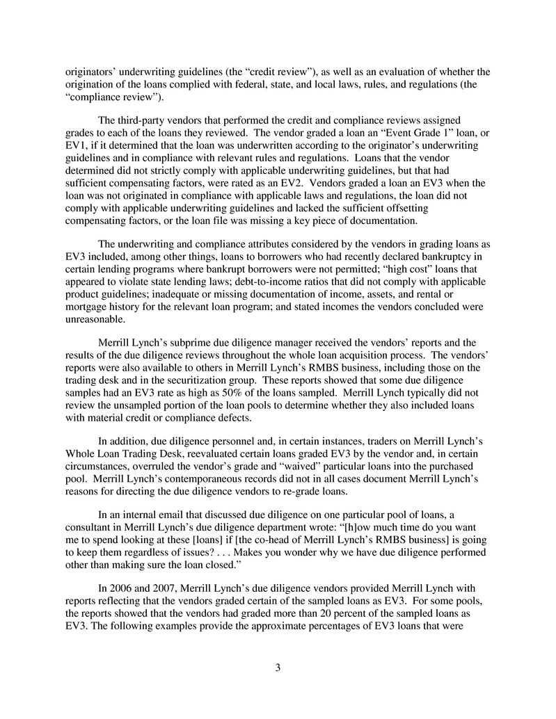 originators’ underwriting guidelines (the “credit review”), as well as an evaluation of whether the origination of the loans complied with federal, state, and local laws, rules, and regulations (the “compliance review”). The third-party vendors that performed the credit and compliance reviews assigned grades to each of the loans they reviewed. The vendor graded a loan an “Event Grade 1” loan, or EV1, if it determined that the loan was underwritten according to the originator’s underwriting guidelines and in compliance with relevant rules and regulations. Loans that the vendor determined did not strictly comply with applicable underwriting guidelines, but that had sufficient compensating factors, were rated as an EV2. Vendors graded a loan an EV3 when the loan was not originated in compliance with applicable laws and regulations, the loan did not comply with applicable underwriting guidelines and lacked the sufficient offsetting compensating factors, or the loan file was missing a key piece of documentation. The underwriting and compliance attributes considered by the vendors in grading loans as EV3 included, among other things, loans to borrowers who had recently declared bankruptcy in certain lending programs where bankrupt borrowers were not permitted; “high cost” loans that appeared to violate state lending laws; debt-to-income ratios that did not comply with applicable product guidelines; inadequate or missing documentation of income, assets, and rental or mortgage history for the relevant loan program; and stated incomes the vendors concluded were unreasonable. Merrill Lynch’s subprime due diligence manager received the vendors’ reports and the results of the due diligence reviews throughout the whole loan acquisition process. The vendors’ reports were also available to others in Merrill Lynch’s RMBS business, including those on the trading desk and in the securitization group. These reports showed that some due diligence samples had an EV3 rate as high as 50% of the loans sampled. Merrill Lynch typically did not review the unsampled portion of the loan pools to determine whether they also included loans with material credit or compliance defects. In addition, due diligence personnel and, in certain instances, traders on Merrill Lynch’s Whole Loan Trading Desk, reevaluated certain loans graded EV3 by the vendor and, in certain circumstances, overruled the vendor’s grade and “waived” particular loans into the purchased pool. Merrill Lynch’s contemporaneous records did not in all cases document Merrill Lynch’s reasons for directing the due diligence vendors to re-grade loans. In an internal email that discussed due diligence on one particular pool of loans, a consultant in Merrill Lynch’s due diligence department wrote: “[h]ow much time do you want me to spend looking at these [loans] if [the co-head of Merrill Lynch’s RMBS business] is going to keep them regardless of issues? . . . Makes you wonder why we have due diligence performed other than making sure the loan closed.” In 2006 and 2007, Merrill Lynch’s due diligence vendors provided Merrill Lynch with reports reflecting that the vendors graded certain of the sampled loans as EV3. For some pools, the reports showed that the vendors had graded more than 20 percent of the sampled loans as EV3. The following examples provide the approximate percentages of EV3 loans that were 3
