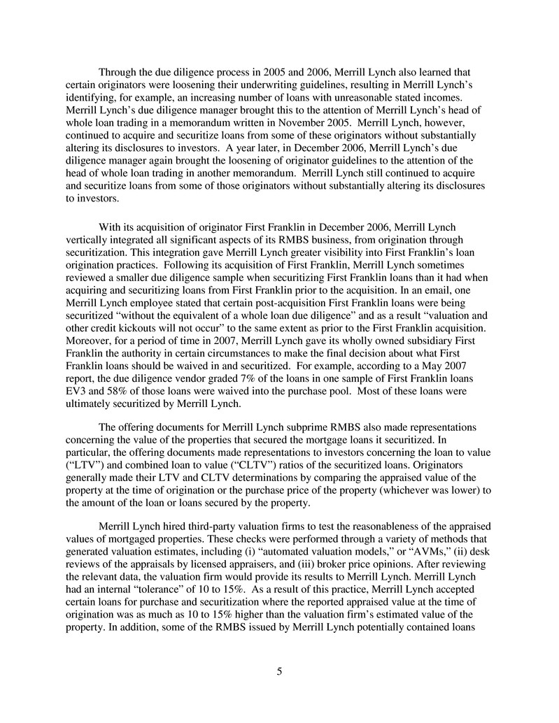 Through the due diligence process in 2005 and 2006, Merrill Lynch also learned that certain originators were loosening their underwriting guidelines, resulting in Merrill Lynch’s identifying, for example, an increasing number of loans with unreasonable stated incomes. Merrill Lynch’s due diligence manager brought this to the attention of Merrill Lynch’s head of whole loan trading in a memorandum written in November 2005. Merrill Lynch, however, continued to acquire and securitize loans from some of these originators without substantially altering its disclosures to investors. A year later, in December 2006, Merrill Lynch’s due diligence manager again brought the loosening of originator guidelines to the attention of the head of whole loan trading in another memorandum. Merrill Lynch still continued to acquire and securitize loans from some of those originators without substantially altering its disclosures to investors. With its acquisition of originator First Franklin in December 2006, Merrill Lynch vertically integrated all significant aspects of its RMBS business, from origination through securitization. This integration gave Merrill Lynch greater visibility into First Franklin’s loan origination practices. Following its acquisition of First Franklin, Merrill Lynch sometimes reviewed a smaller due diligence sample when securitizing First Franklin loans than it had when acquiring and securitizing loans from First Franklin prior to the acquisition. In an email, one Merrill Lynch employee stated that certain post-acquisition First Franklin loans were being securitized “without the equivalent of a whole loan due diligence” and as a result “valuation and other credit kickouts will not occur” to the same extent as prior to the First Franklin acquisition. Moreover, for a period of time in 2007, Merrill Lynch gave its wholly owned subsidiary First Franklin the authority in certain circumstances to make the final decision about what First Franklin loans should be waived in and securitized. For example, according to a May 2007 report, the due diligence vendor graded 7% of the loans in one sample of First Franklin loans EV3 and 58% of those loans were waived into the purchase pool. Most of these loans were ultimately securitized by Merrill Lynch. The offering documents for Merrill Lynch subprime RMBS also made representations concerning the value of the properties that secured the mortgage loans it securitized. In particular, the offering documents made representations to investors concerning the loan to value (“LTV”) and combined loan to value (“CLTV”) ratios of the securitized loans. Originators generally made their LTV and CLTV determinations by comparing the appraised value of the property at the time of origination or the purchase price of the property (whichever was lower) to the amount of the loan or loans secured by the property. Merrill Lynch hired third-party valuation firms to test the reasonableness of the appraised values of mortgaged properties. These checks were performed through a variety of methods that generated valuation estimates, including (i) “automated valuation models,” or “AVMs,” (ii) desk reviews of the appraisals by licensed appraisers, and (iii) broker price opinions. After reviewing the relevant data, the valuation firm would provide its results to Merrill Lynch. Merrill Lynch had an internal “tolerance” of 10 to 15%. As a result of this practice, Merrill Lynch accepted certain loans for purchase and securitization where the reported appraised value at the time of origination was as much as 10 to 15% higher than the valuation firm’s estimated value of the property. In addition, some of the RMBS issued by Merrill Lynch potentially contained loans 5