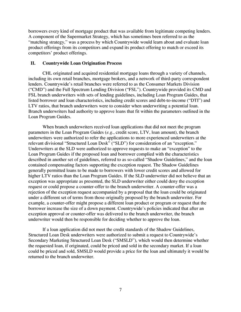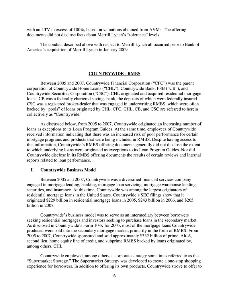 with an LTV in excess of 100%, based on valuations obtained from AVMs. The offering documents did not disclose facts about Merrill Lynch’s “tolerance” levels. The conduct described above with respect to Merrill Lynch all occurred prior to Bank of America’s acquisition of Merrill Lynch in January 2009. COUNTRYWIDE - RMBS Between 2005 and 2007, Countrywide Financial Corporation (“CFC”) was the parent corporation of Countrywide Home Loans (“CHL”), Countrywide Bank, FSB (“CB”), and Countrywide Securities Corporation (“CSC”). CHL originated and acquired residential mortgage loans. CB was a federally chartered savings bank, the deposits of which were federally insured. CSC was a registered broker-dealer that was engaged in underwriting RMBS, which were often backed by “pools” of loans originated by CHL. CFC, CHL, CB, and CSC are referred to herein collectively as “Countrywide.” As discussed below, from 2005 to 2007, Countrywide originated an increasing number of loans as exceptions to its Loan Program Guides. At the same time, employees of Countrywide received information indicating that there was an increased risk of poor performance for certain mortgage programs and products that were being included in RMBS. Despite having access to this information, Countrywide’s RMBS offering documents generally did not disclose the extent to which underlying loans were originated as exceptions to its Loan Program Guides. Nor did Countrywide disclose in its RMBS offering documents the results of certain reviews and internal reports related to loan performance. I. Countrywide Business Model Between 2005 and 2007, Countrywide was a diversified financial services company engaged in mortgage lending, banking, mortgage loan servicing, mortgage warehouse lending, securities, and insurance. At this time, Countrywide was among the largest originators of residential mortgage loans in the United States. Countrywide’s SEC filings show that it originated $229 billion in residential mortgage loans in 2005, $243 billion in 2006, and $205 billion in 2007. Countrywide’s business model was to serve as an intermediary between borrowers seeking residential mortgages and investors seeking to purchase loans in the secondary market. As disclosed in Countrywide’s Form 10-K for 2005, most of the mortgage loans Countrywide produced were sold into the secondary mortgage market, primarily in the form of RMBS. From 2005 to 2007, Countrywide sponsored and sold approximately $332 billion of prime, Alt-A, second lien, home equity line of credit, and subprime RMBS backed by loans originated by, among others, CHL. Countrywide employed, among others, a corporate strategy sometimes referred to as the “Supermarket Strategy.” The Supermarket Strategy was developed to create a one-stop shopping experience for borrowers. In addition to offering its own products, Countrywide strove to offer to 6