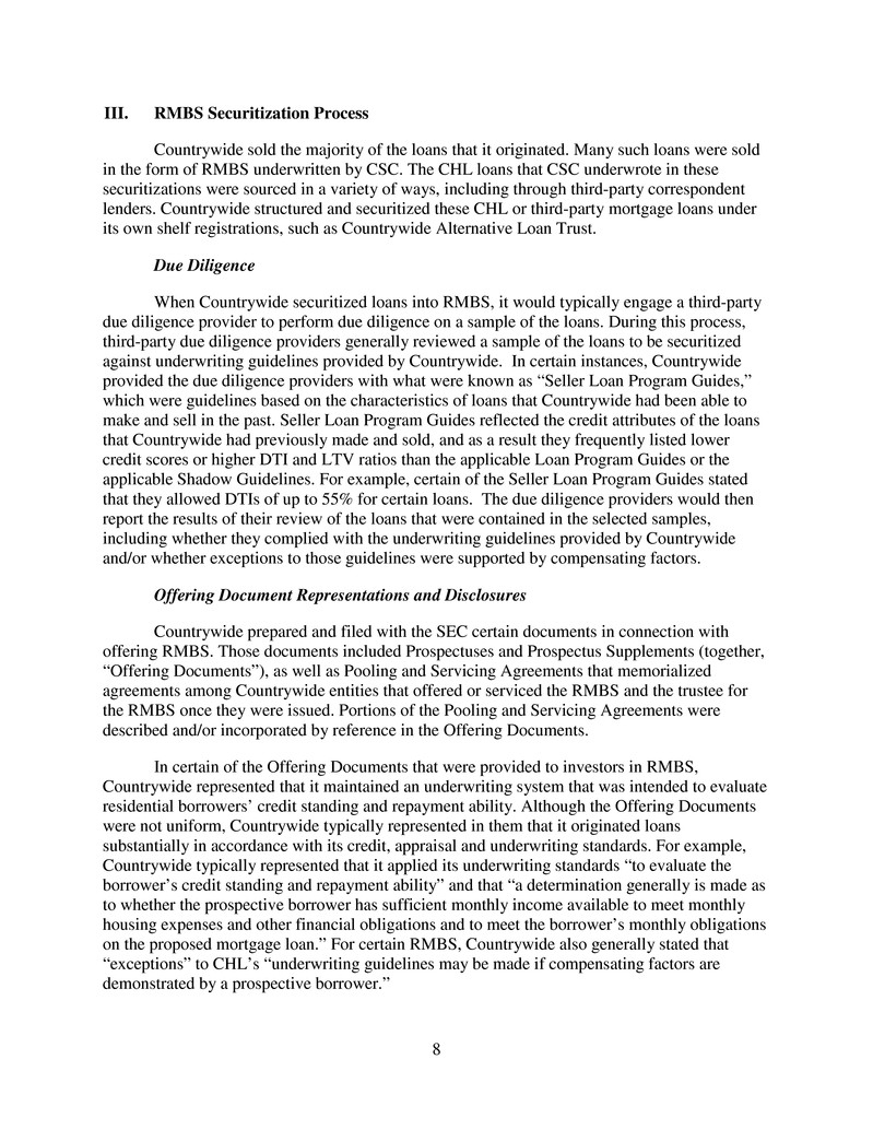 III. RMBS Securitization Process Countrywide sold the majority of the loans that it originated. Many such loans were sold in the form of RMBS underwritten by CSC. The CHL loans that CSC underwrote in these securitizations were sourced in a variety of ways, including through third-party correspondent lenders. Countrywide structured and securitized these CHL or third-party mortgage loans under its own shelf registrations, such as Countrywide Alternative Loan Trust. Due Diligence When Countrywide securitized loans into RMBS, it would typically engage a third-party due diligence provider to perform due diligence on a sample of the loans. During this process, third-party due diligence providers generally reviewed a sample of the loans to be securitized against underwriting guidelines provided by Countrywide. In certain instances, Countrywide provided the due diligence providers with what were known as “Seller Loan Program Guides,” which were guidelines based on the characteristics of loans that Countrywide had been able to make and sell in the past. Seller Loan Program Guides reflected the credit attributes of the loans that Countrywide had previously made and sold, and as a result they frequently listed lower credit scores or higher DTI and LTV ratios than the applicable Loan Program Guides or the applicable Shadow Guidelines. For example, certain of the Seller Loan Program Guides stated that they allowed DTIs of up to 55% for certain loans. The due diligence providers would then report the results of their review of the loans that were contained in the selected samples, including whether they complied with the underwriting guidelines provided by Countrywide and/or whether exceptions to those guidelines were supported by compensating factors. Offering Document Representations and Disclosures Countrywide prepared and filed with the SEC certain documents in connection with offering RMBS. Those documents included Prospectuses and Prospectus Supplements (together, “Offering Documents”), as well as Pooling and Servicing Agreements that memorialized agreements among Countrywide entities that offered or serviced the RMBS and the trustee for the RMBS once they were issued. Portions of the Pooling and Servicing Agreements were described and/or incorporated by reference in the Offering Documents. In certain of the Offering Documents that were provided to investors in RMBS, Countrywide represented that it maintained an underwriting system that was intended to evaluate residential borrowers’ credit standing and repayment ability. Although the Offering Documents were not uniform, Countrywide typically represented in them that it originated loans substantially in accordance with its credit, appraisal and underwriting standards. For example, Countrywide typically represented that it applied its underwriting standards “to evaluate the borrower’s credit standing and repayment ability” and that “a determination generally is made as to whether the prospective borrower has sufficient monthly income available to meet monthly housing expenses and other financial obligations and to meet the borrower’s monthly obligations on the proposed mortgage loan.” For certain RMBS, Countrywide also generally stated that “exceptions” to CHL’s “underwriting guidelines may be made if compensating factors are demonstrated by a prospective borrower.” 8