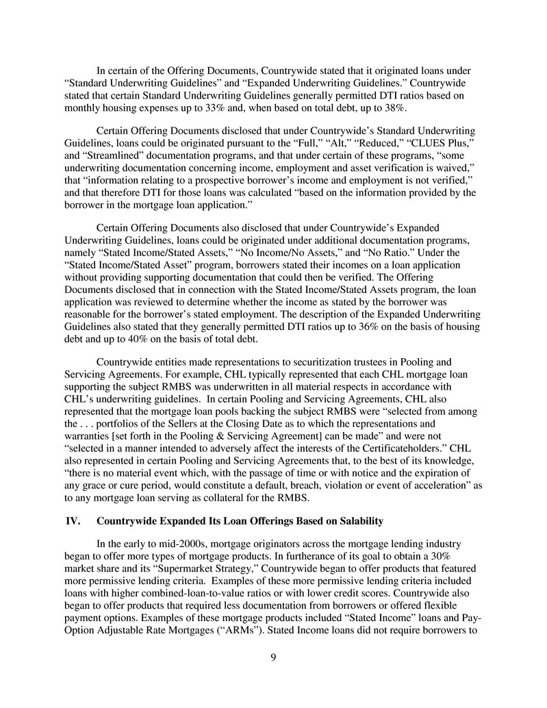 In certain of the Offering Documents, Countrywide stated that it originated loans under “Standard Underwriting Guidelines” and “Expanded Underwriting Guidelines.” Countrywide stated that certain Standard Underwriting Guidelines generally permitted DTI ratios based on monthly housing expenses up to 33% and, when based on total debt, up to 38%. Certain Offering Documents disclosed that under Countrywide’s Standard Underwriting Guidelines, loans could be originated pursuant to the “Full,” “Alt,” “Reduced,” “CLUES Plus,” and “Streamlined” documentation programs, and that under certain of these programs, “some underwriting documentation concerning income, employment and asset verification is waived,” that “information relating to a prospective borrower’s income and employment is not verified,” and that therefore DTI for those loans was calculated “based on the information provided by the borrower in the mortgage loan application.” Certain Offering Documents also disclosed that under Countrywide’s Expanded Underwriting Guidelines, loans could be originated under additional documentation programs, namely “Stated Income/Stated Assets,” “No Income/No Assets,” and “No Ratio.” Under the “Stated Income/Stated Asset” program, borrowers stated their incomes on a loan application without providing supporting documentation that could then be verified. The Offering Documents disclosed that in connection with the Stated Income/Stated Assets program, the loan application was reviewed to determine whether the income as stated by the borrower was reasonable for the borrower’s stated employment. The description of the Expanded Underwriting Guidelines also stated that they generally permitted DTI ratios up to 36% on the basis of housing debt and up to 40% on the basis of total debt. Countrywide entities made representations to securitization trustees in Pooling and Servicing Agreements. For example, CHL typically represented that each CHL mortgage loan supporting the subject RMBS was underwritten in all material respects in accordance with CHL’s underwriting guidelines. In certain Pooling and Servicing Agreements, CHL also represented that the mortgage loan pools backing the subject RMBS were “selected from among the . . . portfolios of the Sellers at the Closing Date as to which the representations and warranties [set forth in the Pooling & Servicing Agreement] can be made” and were not “selected in a manner intended to adversely affect the interests of the Certificateholders.” CHL also represented in certain Pooling and Servicing Agreements that, to the best of its knowledge, “there is no material event which, with the passage of time or with notice and the expiration of any grace or cure period, would constitute a default, breach, violation or event of acceleration” as to any mortgage loan serving as collateral for the RMBS. IV. Countrywide Expanded Its Loan Offerings Based on Salability In the early to mid-2000s, mortgage originators across the mortgage lending industry began to offer more types of mortgage products. In furtherance of its goal to obtain a 30% market share and its “Supermarket Strategy,” Countrywide began to offer products that featured more permissive lending criteria. Examples of these more permissive lending criteria included loans with higher combined-loan-to-value ratios or with lower credit scores. Countrywide also began to offer products that required less documentation from borrowers or offered flexible payment options. Examples of these mortgage products included “Stated Income” loans and Pay- Option Adjustable Rate Mortgages (“ARMs”). Stated Income loans did not require borrowers to 9