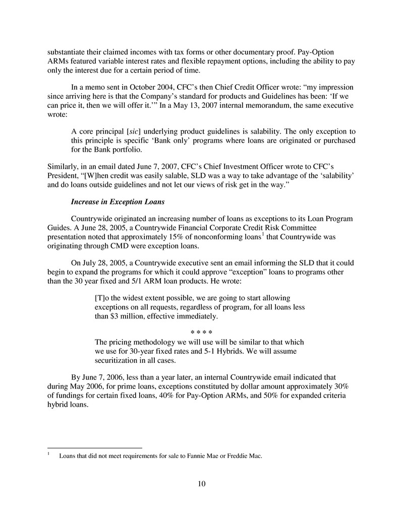 substantiate their claimed incomes with tax forms or other documentary proof. Pay-Option ARMs featured variable interest rates and flexible repayment options, including the ability to pay only the interest due for a certain period of time. In a memo sent in October 2004, CFC’s then Chief Credit Officer wrote: “my impression since arriving here is that the Company’s standard for products and Guidelines has been: ‘If we can price it, then we will offer it.’” In a May 13, 2007 internal memorandum, the same executive wrote: A core principal [sic] underlying product guidelines is salability. The only exception to this principle is specific ‘Bank only’ programs where loans are originated or purchased for the Bank portfolio. Similarly, in an email dated June 7, 2007, CFC’s Chief Investment Officer wrote to CFC’s President, “[W]hen credit was easily salable, SLD was a way to take advantage of the ‘salability’ and do loans outside guidelines and not let our views of risk get in the way.” Increase in Exception Loans Countrywide originated an increasing number of loans as exceptions to its Loan Program Guides. A June 28, 2005, a Countrywide Financial Corporate Credit Risk Committee presentation noted that approximately 15% of nonconforming loans1 that Countrywide was originating through CMD were exception loans. On July 28, 2005, a Countrywide executive sent an email informing the SLD that it could begin to expand the programs for which it could approve “exception” loans to programs other than the 30 year fixed and 5/1 ARM loan products. He wrote: [T]o the widest extent possible, we are going to start allowing exceptions on all requests, regardless of program, for all loans less than $3 million, effective immediately. * * * * The pricing methodology we will use will be similar to that which we use for 30-year fixed rates and 5-1 Hybrids. We will assume securitization in all cases. By June 7, 2006, less than a year later, an internal Countrywide email indicated that during May 2006, for prime loans, exceptions constituted by dollar amount approximately 30% of fundings for certain fixed loans, 40% for Pay-Option ARMs, and 50% for expanded criteria hybrid loans. 1 Loans that did not meet requirements for sale to Fannie Mae or Freddie Mac. 10