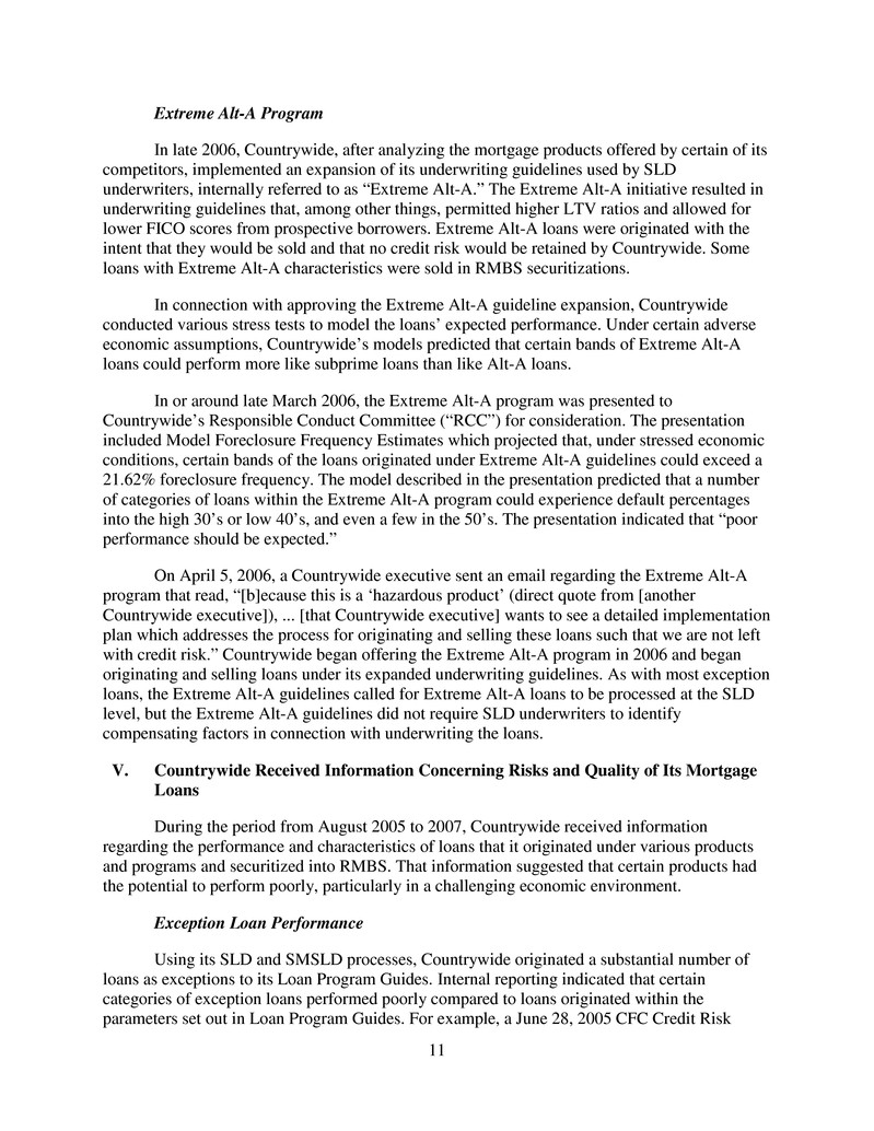 Extreme Alt-A Program In late 2006, Countrywide, after analyzing the mortgage products offered by certain of its competitors, implemented an expansion of its underwriting guidelines used by SLD underwriters, internally referred to as “Extreme Alt-A.” The Extreme Alt-A initiative resulted in underwriting guidelines that, among other things, permitted higher LTV ratios and allowed for lower FICO scores from prospective borrowers. Extreme Alt-A loans were originated with the intent that they would be sold and that no credit risk would be retained by Countrywide. Some loans with Extreme Alt-A characteristics were sold in RMBS securitizations. In connection with approving the Extreme Alt-A guideline expansion, Countrywide conducted various stress tests to model the loans’ expected performance. Under certain adverse economic assumptions, Countrywide’s models predicted that certain bands of Extreme Alt-A loans could perform more like subprime loans than like Alt-A loans. In or around late March 2006, the Extreme Alt-A program was presented to Countrywide’s Responsible Conduct Committee (“RCC”) for consideration. The presentation included Model Foreclosure Frequency Estimates which projected that, under stressed economic conditions, certain bands of the loans originated under Extreme Alt-A guidelines could exceed a 21.62% foreclosure frequency. The model described in the presentation predicted that a number of categories of loans within the Extreme Alt-A program could experience default percentages into the high 30’s or low 40’s, and even a few in the 50’s. The presentation indicated that “poor performance should be expected.” On April 5, 2006, a Countrywide executive sent an email regarding the Extreme Alt-A program that read, “[b]ecause this is a ‘hazardous product’ (direct quote from [another Countrywide executive]), ... [that Countrywide executive] wants to see a detailed implementation plan which addresses the process for originating and selling these loans such that we are not left with credit risk.” Countrywide began offering the Extreme Alt-A program in 2006 and began originating and selling loans under its expanded underwriting guidelines. As with most exception loans, the Extreme Alt-A guidelines called for Extreme Alt-A loans to be processed at the SLD level, but the Extreme Alt-A guidelines did not require SLD underwriters to identify compensating factors in connection with underwriting the loans. V. Countrywide Received Information Concerning Risks and Quality of Its Mortgage Loans During the period from August 2005 to 2007, Countrywide received information regarding the performance and characteristics of loans that it originated under various products and programs and securitized into RMBS. That information suggested that certain products had the potential to perform poorly, particularly in a challenging economic environment. Exception Loan Performance Using its SLD and SMSLD processes, Countrywide originated a substantial number of loans as exceptions to its Loan Program Guides. Internal reporting indicated that certain categories of exception loans performed poorly compared to loans originated within the parameters set out in Loan Program Guides. For example, a June 28, 2005 CFC Credit Risk 11