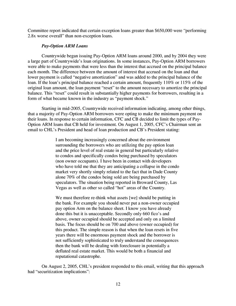 Committee report indicated that certain exception loans greater than $650,000 were “performing 2.8x worse overall” than non-exception loans. Pay-Option ARM Loans Countrywide began issuing Pay-Option ARM loans around 2000, and by 2004 they were a large part of Countrywide’s loan originations. In some instances, Pay-Option ARM borrowers were able to make payments that were less than the interest that accrued on the principal balance each month. The difference between the amount of interest that accrued on the loan and that lower payment is called “negative amortization” and was added to the principal balance of the loan. If the loan’s principal balance reached a certain amount, frequently 110% or 115% of the original loan amount, the loan payment “reset” to the amount necessary to amortize the principal balance. This “reset” could result in substantially higher payments for borrowers, resulting in a form of what became known in the industry as “payment shock.” Starting in mid-2005, Countrywide received information indicating, among other things, that a majority of Pay-Option ARM borrowers were opting to make the minimum payment on their loans. In response to certain information, CFC and CB decided to limit the types of Pay- Option ARM loans that CB held for investment. On August 1, 2005, CFC’s Chairman sent an email to CHL’s President and head of loan production and CB’s President stating: I am becoming increasingly concerned about the environment surrounding the borrowers who are utilizing the pay option loan and the price level of real estate in general but particularly relative to condos and specifically condos being purchased by speculators (non owner occupants). I have been in contact with developers who have told me that they are anticipating a collapse in the condo market very shortly simply related to the fact that in Dade County alone 70% of the condos being sold are being purchased by speculators. The situation being reported in Broward County, Las Vegas as well as other so called “hot” areas of the Country. We must therefore re-think what assets [we] should be putting in the bank. For example you should never put a non-owner occupied pay option Arm on the balance sheet. I know you have already done this but it is unacceptable. Secondly only 660 fico’s and above, owner occupied should be accepted and only on a limited basis. The focus should be on 700 and above (owner occupied) for this product. The simple reason is that when the loan resets in five years there will be enormous payment shock and the borrower is not sufficiently sophisticated to truly understand the consequences then the bank will be dealing with foreclosure in potentially a deflated real estate market. This would be both a financial and reputational catastrophe. On August 2, 2005, CHL’s president responded to this email, writing that this approach had “securitization implications”: 12