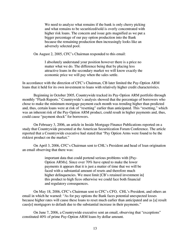 We need to analyze what remains if the bank is only cherry picking and what remains to be securitized/sold is overly concentrated with higher risk loans. The concern and issue gets magnified as we put a bigger percentage of our pay option production into the Bank because the remaining production then increasingly looks like an adversely selected pool. On August 2, 2005, CFC’s Chairman responded to this email: I absolutely understand your position however there is a price no matter what we do. The difference being that by placing less attractive loans in the secondary market we will know exactly the economic price we will pay when the sales settle. In accordance with the direction of CFC’s Chairman, CB later limited the Pay-Option ARM loans that it held for its own investment to loans with relatively higher credit characteristics. Beginning in October 2005, Countrywide tracked its Pay-Option ARM portfolio through monthly “Flash Reports.” Countrywide’s analysis showed that the percentage of borrowers who chose to make the minimum mortgage payment each month was trending higher than predicted and, thus, certain loans were at risk of “resetting” earlier than anticipated. This “resetting,” which was an inherent risk of the Pay-Option ARM product, could result in higher payments and, thus, could cause “payment shock” for borrowers. On February 3, 2006, an article in Inside Mortgage Finance Publications reported on a study that Countrywide presented at the American Securitization Forum Conference. The article reported that a Countrywide executive had stated that “Pay Option Arms were found to be the riskiest product on the market.” On April 3, 2006, CFC’s Chairman sent to CHL’s President and head of loan origination an email observing that there was: important data that could portend serious problems with [Pay- Option ARMs]. Since over 70% have opted to make the lower payments it appears that it is just a matter of time that we will be faced with a substantial amount of resets and therefore much higher delinquencies. We must limit [CB’s retained investment in] this product to high ficos otherwise we could face both financial and regulatory consequences. On May 18, 2006, CFC’s Chairman sent to CFC’s CFO, CHL’s President, and others an email in which he warned: “As for pay options the Bank faces potential unexpected losses because higher rates will cause these loans to reset much earlier than anticipated and as [a] result caus[e] mortgagors to default due to the substantial increase in their payments.” On June 7, 2006, a Countrywide executive sent an email, observing that “exceptions” constituted 40% of prime Pay-Option ARM loans by dollar amount. 13