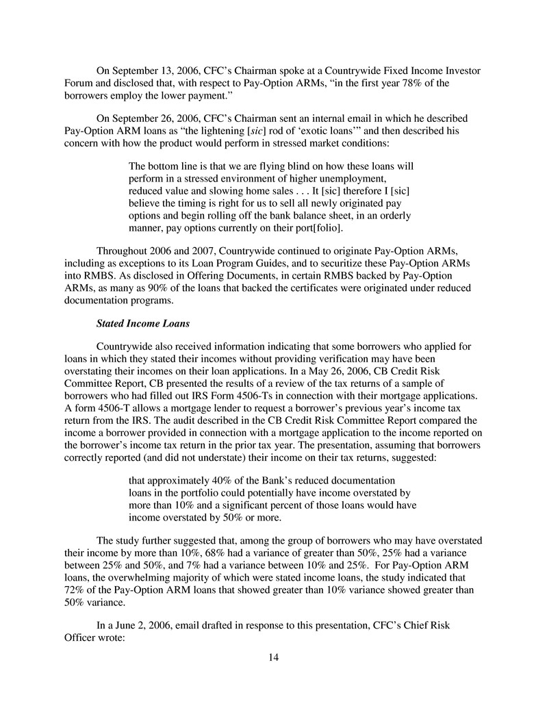 On September 13, 2006, CFC’s Chairman spoke at a Countrywide Fixed Income Investor Forum and disclosed that, with respect to Pay-Option ARMs, “in the first year 78% of the borrowers employ the lower payment.” On September 26, 2006, CFC’s Chairman sent an internal email in which he described Pay-Option ARM loans as “the lightening [sic] rod of ‘exotic loans’” and then described his concern with how the product would perform in stressed market conditions: The bottom line is that we are flying blind on how these loans will perform in a stressed environment of higher unemployment, reduced value and slowing home sales . . . It [sic] therefore I [sic] believe the timing is right for us to sell all newly originated pay options and begin rolling off the bank balance sheet, in an orderly manner, pay options currently on their port[folio]. Throughout 2006 and 2007, Countrywide continued to originate Pay-Option ARMs, including as exceptions to its Loan Program Guides, and to securitize these Pay-Option ARMs into RMBS. As disclosed in Offering Documents, in certain RMBS backed by Pay-Option ARMs, as many as 90% of the loans that backed the certificates were originated under reduced documentation programs. Stated Income Loans Countrywide also received information indicating that some borrowers who applied for loans in which they stated their incomes without providing verification may have been overstating their incomes on their loan applications. In a May 26, 2006, CB Credit Risk Committee Report, CB presented the results of a review of the tax returns of a sample of borrowers who had filled out IRS Form 4506-Ts in connection with their mortgage applications. A form 4506-T allows a mortgage lender to request a borrower’s previous year’s income tax return from the IRS. The audit described in the CB Credit Risk Committee Report compared the income a borrower provided in connection with a mortgage application to the income reported on the borrower’s income tax return in the prior tax year. The presentation, assuming that borrowers correctly reported (and did not understate) their income on their tax returns, suggested: that approximately 40% of the Bank’s reduced documentation loans in the portfolio could potentially have income overstated by more than 10% and a significant percent of those loans would have income overstated by 50% or more. The study further suggested that, among the group of borrowers who may have overstated their income by more than 10%, 68% had a variance of greater than 50%, 25% had a variance between 25% and 50%, and 7% had a variance between 10% and 25%. For Pay-Option ARM loans, the overwhelming majority of which were stated income loans, the study indicated that 72% of the Pay-Option ARM loans that showed greater than 10% variance showed greater than 50% variance. In a June 2, 2006, email drafted in response to this presentation, CFC’s Chief Risk Officer wrote: 14