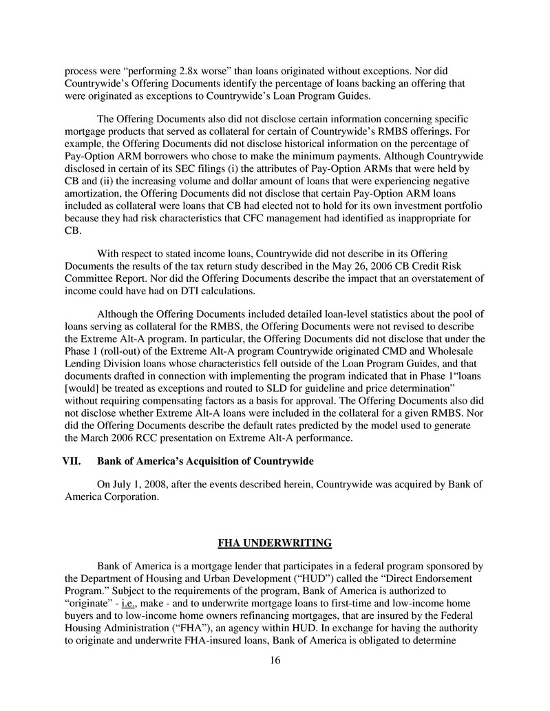 process were “performing 2.8x worse” than loans originated without exceptions. Nor did Countrywide’s Offering Documents identify the percentage of loans backing an offering that were originated as exceptions to Countrywide’s Loan Program Guides. The Offering Documents also did not disclose certain information concerning specific mortgage products that served as collateral for certain of Countrywide’s RMBS offerings. For example, the Offering Documents did not disclose historical information on the percentage of Pay-Option ARM borrowers who chose to make the minimum payments. Although Countrywide disclosed in certain of its SEC filings (i) the attributes of Pay-Option ARMs that were held by CB and (ii) the increasing volume and dollar amount of loans that were experiencing negative amortization, the Offering Documents did not disclose that certain Pay-Option ARM loans included as collateral were loans that CB had elected not to hold for its own investment portfolio because they had risk characteristics that CFC management had identified as inappropriate for CB. With respect to stated income loans, Countrywide did not describe in its Offering Documents the results of the tax return study described in the May 26, 2006 CB Credit Risk Committee Report. Nor did the Offering Documents describe the impact that an overstatement of income could have had on DTI calculations. Although the Offering Documents included detailed loan-level statistics about the pool of loans serving as collateral for the RMBS, the Offering Documents were not revised to describe the Extreme Alt-A program. In particular, the Offering Documents did not disclose that under the Phase 1 (roll-out) of the Extreme Alt-A program Countrywide originated CMD and Wholesale Lending Division loans whose characteristics fell outside of the Loan Program Guides, and that documents drafted in connection with implementing the program indicated that in Phase 1“loans [would] be treated as exceptions and routed to SLD for guideline and price determination” without requiring compensating factors as a basis for approval. The Offering Documents also did not disclose whether Extreme Alt-A loans were included in the collateral for a given RMBS. Nor did the Offering Documents describe the default rates predicted by the model used to generate the March 2006 RCC presentation on Extreme Alt-A performance. VII. Bank of America’s Acquisition of Countrywide On July 1, 2008, after the events described herein, Countrywide was acquired by Bank of America Corporation. FHA UNDERWRITING Bank of America is a mortgage lender that participates in a federal program sponsored by the Department of Housing and Urban Development (“HUD”) called the “Direct Endorsement Program.” Subject to the requirements of the program, Bank of America is authorized to “originate” - i.e., make - and to underwrite mortgage loans to first-time and low-income home buyers and to low-income home owners refinancing mortgages, that are insured by the Federal Housing Administration (“FHA”), an agency within HUD. In exchange for having the authority to originate and underwrite FHA-insured loans, Bank of America is obligated to determine 16