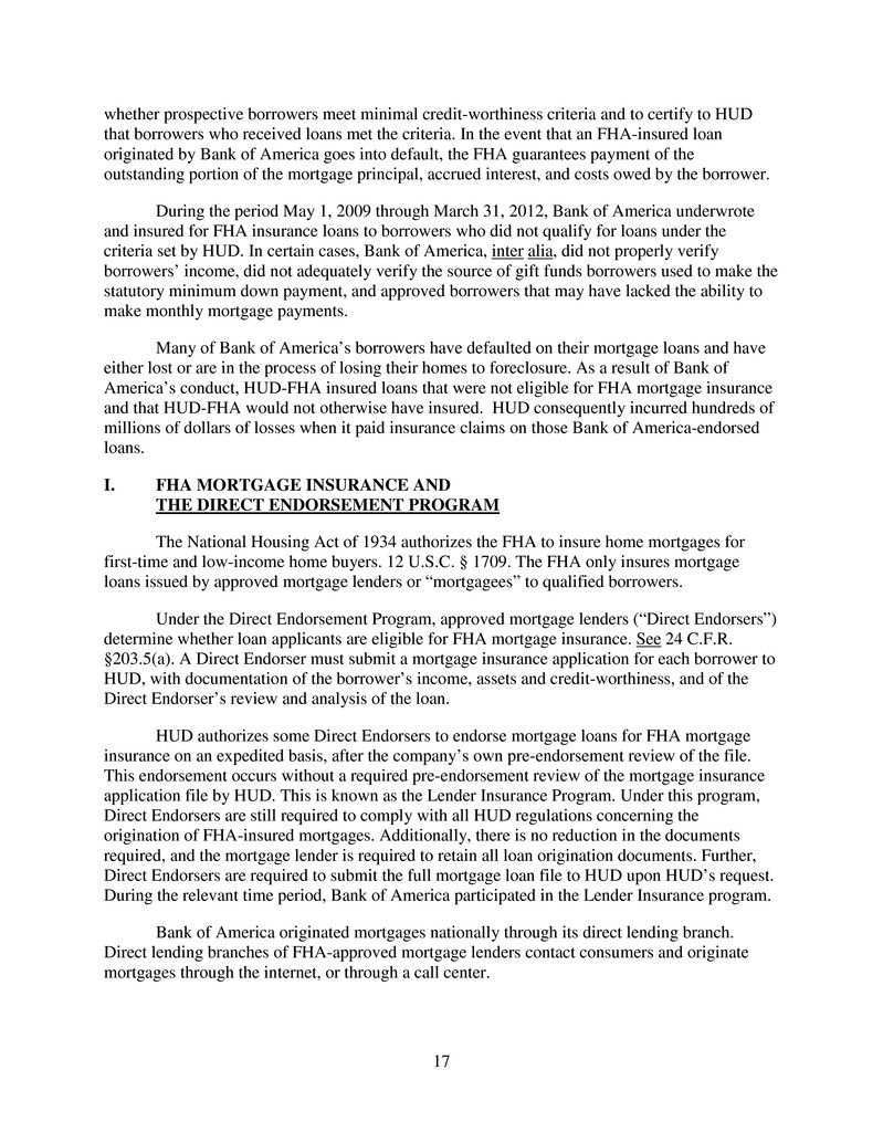 whether prospective borrowers meet minimal credit-worthiness criteria and to certify to HUD that borrowers who received loans met the criteria. In the event that an FHA-insured loan originated by Bank of America goes into default, the FHA guarantees payment of the outstanding portion of the mortgage principal, accrued interest, and costs owed by the borrower. During the period May 1, 2009 through March 31, 2012, Bank of America underwrote and insured for FHA insurance loans to borrowers who did not qualify for loans under the criteria set by HUD. In certain cases, Bank of America, inter alia, did not properly verify borrowers’ income, did not adequately verify the source of gift funds borrowers used to make the statutory minimum down payment, and approved borrowers that may have lacked the ability to make monthly mortgage payments. Many of Bank of America’s borrowers have defaulted on their mortgage loans and have either lost or are in the process of losing their homes to foreclosure. As a result of Bank of America’s conduct, HUD-FHA insured loans that were not eligible for FHA mortgage insurance and that HUD-FHA would not otherwise have insured. HUD consequently incurred hundreds of millions of dollars of losses when it paid insurance claims on those Bank of America-endorsed loans. I. FHA MORTGAGE INSURANCE AND THE DIRECT ENDORSEMENT PROGRAM The National Housing Act of 1934 authorizes the FHA to insure home mortgages for first-time and low-income home buyers. 12 U.S.C. § 1709. The FHA only insures mortgage loans issued by approved mortgage lenders or “mortgagees” to qualified borrowers. Under the Direct Endorsement Program, approved mortgage lenders (“Direct Endorsers”) determine whether loan applicants are eligible for FHA mortgage insurance. See 24 C.F.R. §203.5(a). A Direct Endorser must submit a mortgage insurance application for each borrower to HUD, with documentation of the borrower’s income, assets and credit-worthiness, and of the Direct Endorser’s review and analysis of the loan. HUD authorizes some Direct Endorsers to endorse mortgage loans for FHA mortgage insurance on an expedited basis, after the company’s own pre-endorsement review of the file. This endorsement occurs without a required pre-endorsement review of the mortgage insurance application file by HUD. This is known as the Lender Insurance Program. Under this program, Direct Endorsers are still required to comply with all HUD regulations concerning the origination of FHA-insured mortgages. Additionally, there is no reduction in the documents required, and the mortgage lender is required to retain all loan origination documents. Further, Direct Endorsers are required to submit the full mortgage loan file to HUD upon HUD’s request. During the relevant time period, Bank of America participated in the Lender Insurance program. Bank of America originated mortgages nationally through its direct lending branch. Direct lending branches of FHA-approved mortgage lenders contact consumers and originate mortgages through the internet, or through a call center. 17