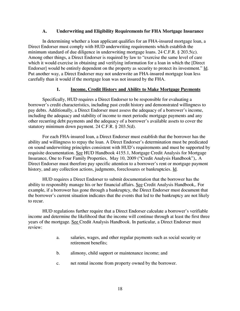 A. Underwriting and Eligibility Requirements for FHA Mortgage Insurance In determining whether a loan applicant qualifies for an FHA-insured mortgage loan, a Direct Endorser must comply with HUD underwriting requirements which establish the minimum standard of due diligence in underwriting mortgage loans. 24 C.F.R. § 203.5(c). Among other things, a Direct Endorser is required by law to “exercise the same level of care which it would exercise in obtaining and verifying information for a loan in which the [Direct Endorser] would be entirely dependent on the property as security to protect its investment.” Id. Put another way, a Direct Endorser may not underwrite an FHA-insured mortgage loan less carefully than it would if the mortgage loan was not insured by the FHA. 1. Income, Credit History and Ability to Make Mortgage Payments Specifically, HUD requires a Direct Endorser to be responsible for evaluating a borrower’s credit characteristics, including past credit history and demonstrated willingness to pay debts. Additionally, a Direct Endorser must assess the adequacy of a borrower’s income, including the adequacy and stability of income to meet periodic mortgage payments and any other recurring debt payments and the adequacy of a borrower’s available assets to cover the statutory minimum down payment. 24 C.F.R. § 203.5(d). For each FHA-insured loan, a Direct Endorser must establish that the borrower has the ability and willingness to repay the loan. A Direct Endorser’s determination must be predicated on sound underwriting principles consistent with HUD’s requirements and must be supported by requisite documentation. See HUD Handbook 4155.1, Mortgage Credit Analysis for Mortgage Insurance, One to Four Family Properties, May 10, 2009 (“Credit Analysis Handbook”),. A Direct Endorser must therefore pay specific attention to a borrower’s rent or mortgage payment history, and any collection actions, judgments, foreclosures or bankruptcies. Id. HUD requires a Direct Endorser to submit documentation that the borrower has the ability to responsibly manage his or her financial affairs. See Credit Analysis Handbook,. For example, if a borrower has gone through a bankruptcy, the Direct Endorser must document that the borrower’s current situation indicates that the events that led to the bankruptcy are not likely to recur. HUD regulations further require that a Direct Endorser calculate a borrower’s verifiable income and determine the likelihood that the income will continue through at least the first three years of the mortgage. See Credit Analysis Handbook. In particular, a Direct Endorser must review: a. salaries, wages, and other regular payments such as social security or retirement benefits; b. alimony, child support or maintenance income; and c. net rental income from property owned by the borrower. 18