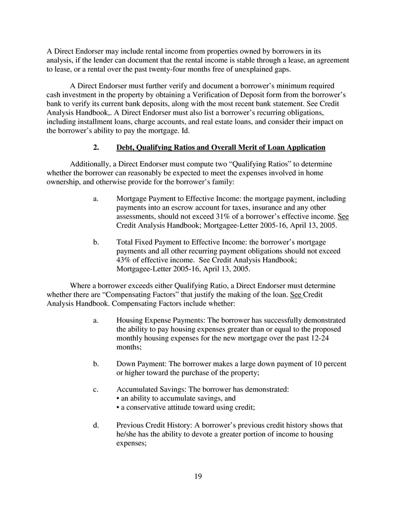 A Direct Endorser may include rental income from properties owned by borrowers in its analysis, if the lender can document that the rental income is stable through a lease, an agreement to lease, or a rental over the past twenty-four months free of unexplained gaps. A Direct Endorser must further verify and document a borrower’s minimum required cash investment in the property by obtaining a Verification of Deposit form from the borrower’s bank to verify its current bank deposits, along with the most recent bank statement. See Credit Analysis Handbook,. A Direct Endorser must also list a borrower’s recurring obligations, including installment loans, charge accounts, and real estate loans, and consider their impact on the borrower’s ability to pay the mortgage. Id. 2. Debt, Qualifying Ratios and Overall Merit of Loan Application Additionally, a Direct Endorser must compute two “Qualifying Ratios” to determine whether the borrower can reasonably be expected to meet the expenses involved in home ownership, and otherwise provide for the borrower’s family: a. Mortgage Payment to Effective Income: the mortgage payment, including payments into an escrow account for taxes, insurance and any other assessments, should not exceed 31% of a borrower’s effective income. See Credit Analysis Handbook; Mortgagee-Letter 2005-16, April 13, 2005. b. Total Fixed Payment to Effective Income: the borrower’s mortgage payments and all other recurring payment obligations should not exceed 43% of effective income. See Credit Analysis Handbook; Mortgagee-Letter 2005-16, April 13, 2005. Where a borrower exceeds either Qualifying Ratio, a Direct Endorser must determine whether there are “Compensating Factors” that justify the making of the loan. See Credit Analysis Handbook. Compensating Factors include whether: a. Housing Expense Payments: The borrower has successfully demonstrated the ability to pay housing expenses greater than or equal to the proposed monthly housing expenses for the new mortgage over the past 12-24 months; b. Down Payment: The borrower makes a large down payment of 10 percent or higher toward the purchase of the property; c. Accumulated Savings: The borrower has demonstrated: • an ability to accumulate savings, and • a conservative attitude toward using credit; d. Previous Credit History: A borrower’s previous credit history shows that he/she has the ability to devote a greater portion of income to housing expenses; 19