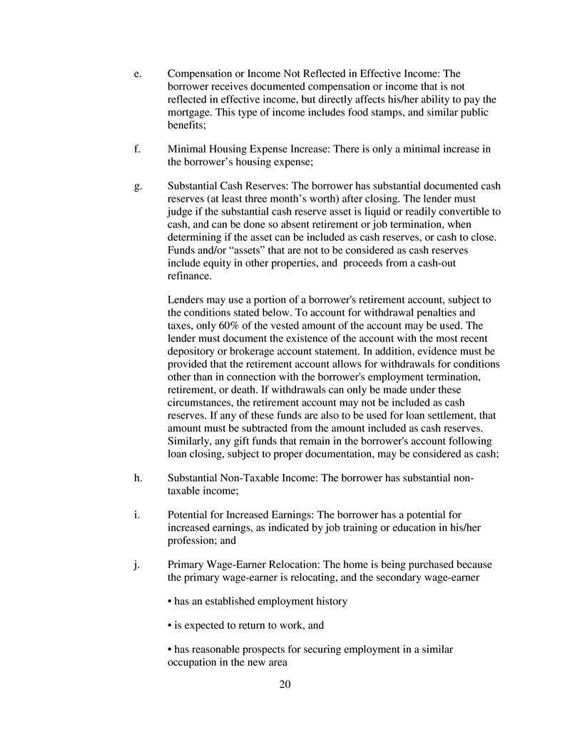 e. Compensation or Income Not Reflected in Effective Income: The borrower receives documented compensation or income that is not reflected in effective income, but directly affects his/her ability to pay the mortgage. This type of income includes food stamps, and similar public benefits; f. Minimal Housing Expense Increase: There is only a minimal increase in the borrower’s housing expense; g. Substantial Cash Reserves: The borrower has substantial documented cash reserves (at least three month’s worth) after closing. The lender must judge if the substantial cash reserve asset is liquid or readily convertible to cash, and can be done so absent retirement or job termination, when determining if the asset can be included as cash reserves, or cash to close. Funds and/or “assets” that are not to be considered as cash reserves include equity in other properties, and proceeds from a cash-out refinance. Lenders may use a portion of a borrower's retirement account, subject to the conditions stated below. To account for withdrawal penalties and taxes, only 60% of the vested amount of the account may be used. The lender must document the existence of the account with the most recent depository or brokerage account statement. In addition, evidence must be provided that the retirement account allows for withdrawals for conditions other than in connection with the borrower's employment termination, retirement, or death. If withdrawals can only be made under these circumstances, the retirement account may not be included as cash reserves. If any of these funds are also to be used for loan settlement, that amount must be subtracted from the amount included as cash reserves. Similarly, any gift funds that remain in the borrower's account following loan closing, subject to proper documentation, may be considered as cash; h. Substantial Non-Taxable Income: The borrower has substantial non- taxable income; i. Potential for Increased Earnings: The borrower has a potential for increased earnings, as indicated by job training or education in his/her profession; and j. Primary Wage-Earner Relocation: The home is being purchased because the primary wage-earner is relocating, and the secondary wage-earner • has an established employment history • is expected to return to work, and • has reasonable prospects for securing employment in a similar occupation in the new area 20